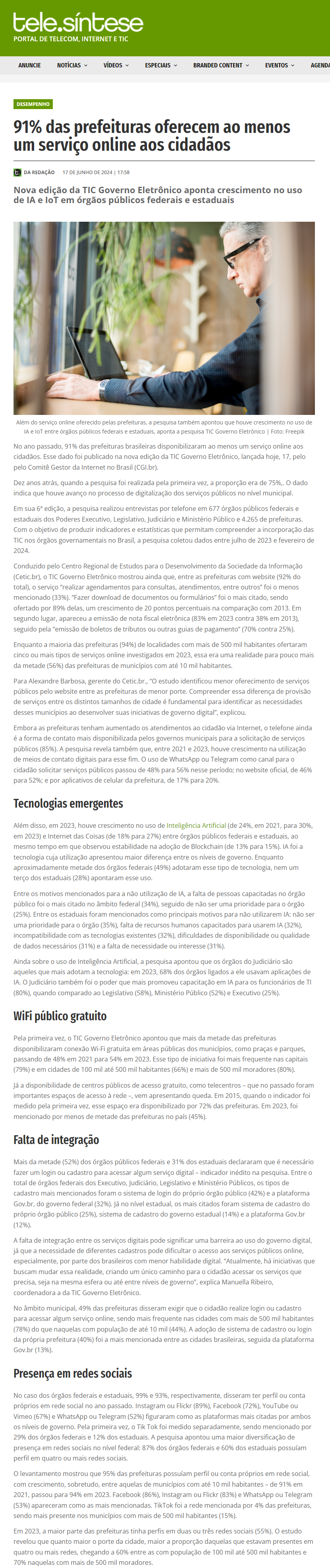 Em sua 6ª edição, a pesquisa realizou entrevistas por telefone em 677 órgãos públicos federais e estaduais dos Poderes Executivo, Legislativo, Judiciário e Ministério Público e 4.265 de prefeituras. Com o objetivo de produzir indicadores e estatísticas que permitam compreender a incorporação das TIC nos órgãos governamentais no Brasil, a pesquisa coletou dados entre julho de 2023 e fevereiro de 2024.