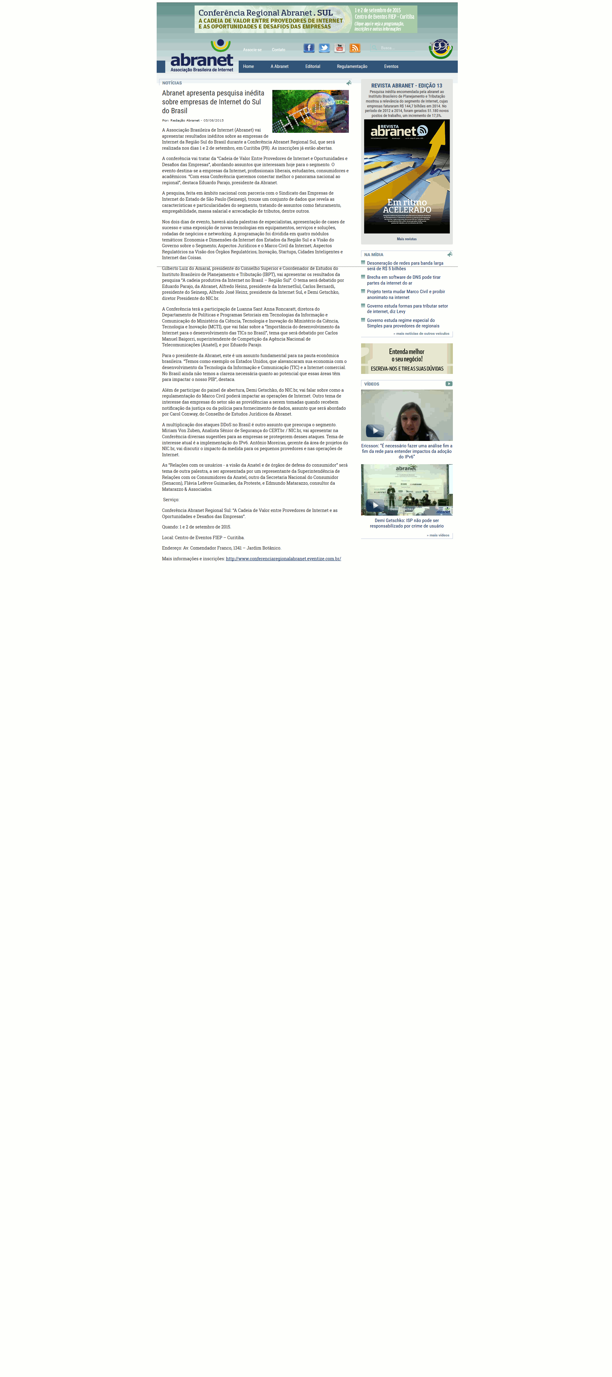 Conferência Abranet Regional Sul: “A Cadeia de Valor entre Provedores de Internet e as Oportunidades e Desafios das Empresas”.