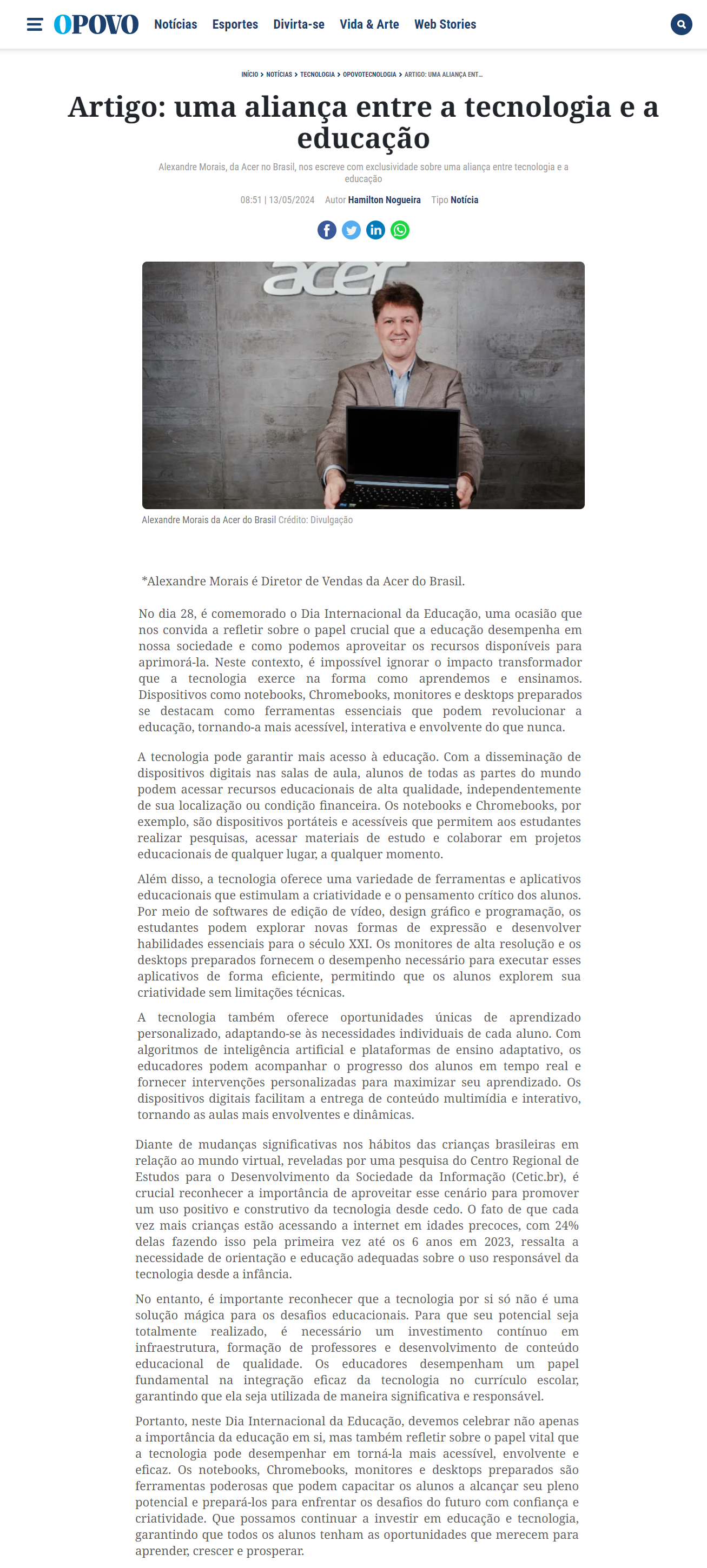Alexandre Morais, da Acer no Brasil, nos escreve com exclusividade sobre uma aliança entre tecnologia e a educação