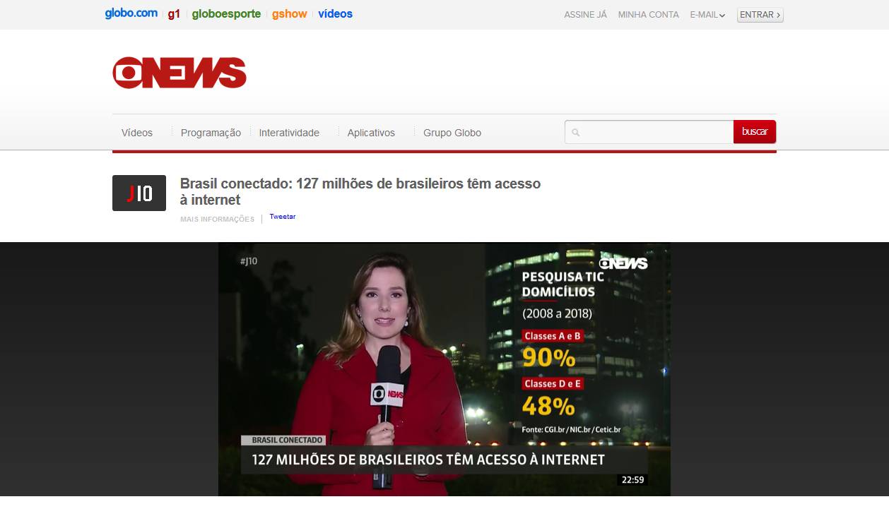 Confira a reportagem completa em: https://g1.globo.com/globo-news/jornal-das-dez/videos/v/brasil-conectado-127-milhoes-de-brasileiros-tem-acesso-a-internet/7879840/.