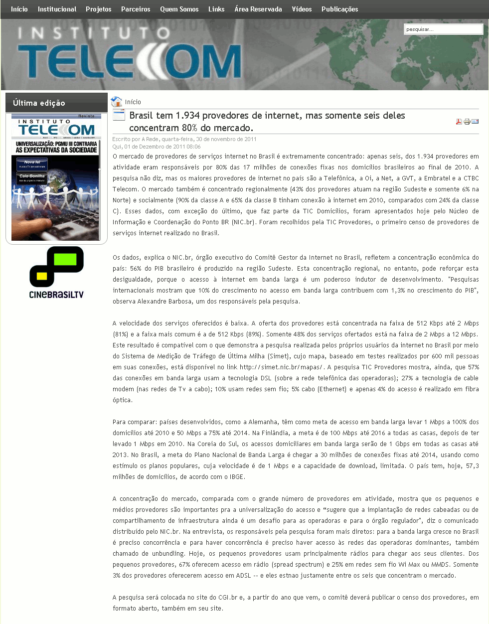 O mercado de provedores de serviços internet no Brasil é extremamente concentrado: apenas seis, dos 1.934 provedores em atividade eram responsáveis por 80% das 17 milhões de conexões fixas nos domicílios brasileiros ao final de 2010. A pesquisa não diz, mas os maiores provedores de internet no país são a Telefônica, a Oi, a Net, a GVT, a Embratel e a CTBC Telecom. O mercado também é concentrado regionalmente (43% dos provedores atuam na região Sudeste e somente 6% na Norte) e socialmente (90% da classe A e 65% da classe B tinham conexão à internet em 2010, comparados com 24% da classe C). Esses dados, com exceção do último, que faz parte da TIC Domicílios, foram apresentados hoje pelo Núcleo de Informação e Coordenação do Ponto BR (NIC.br). Foram recolhidos pela TIC Provedores, o primeiro censo de provedores de serviços internet realizado no Brasil.