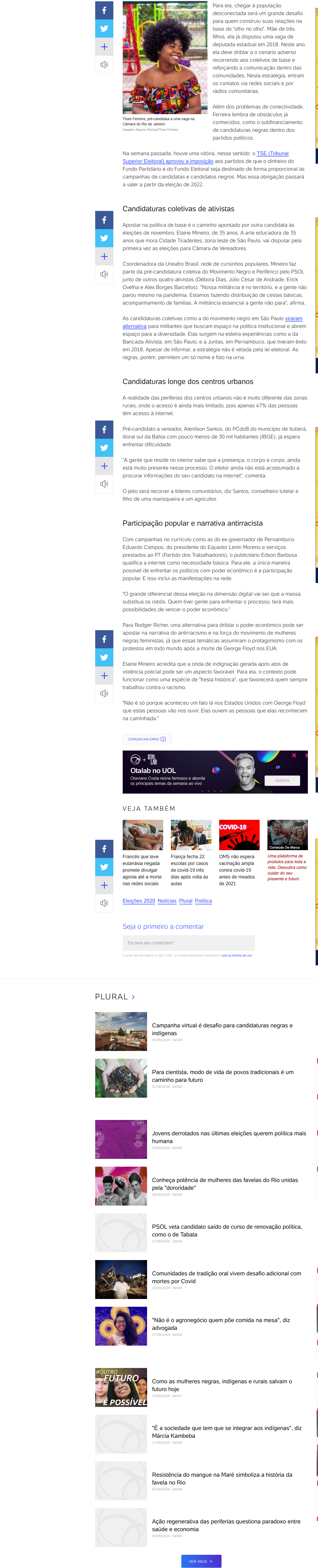 Candidatos negros, indígenas e de periferia já traçam a estratégia para o que consideram ser um grande desafio para as eleições de 2020, em meio à pandemia do novo coronavírus. Sem vacina e com as medidas de isolamento e o distanciamento social ainda em vigor, a campanha eleitoral sai das ruas e deve se concentrar na internet. Mas esses candidatos e os seus potenciais eleitores enfrentam dificuldades de conexão.