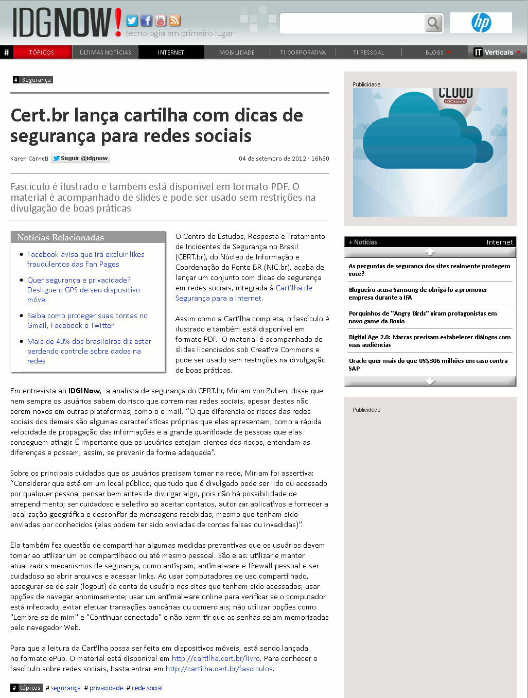 Para que a leitura da Cartilha possa ser feita em dispositivos móveis, está sendo lançada no formato ePub. O material está disponível em http://cartilha.cert.br/livro. Para conhecer o fascículo sobre redes sociais, basta entrar em http://cartilha.cert.br/fasciculos.