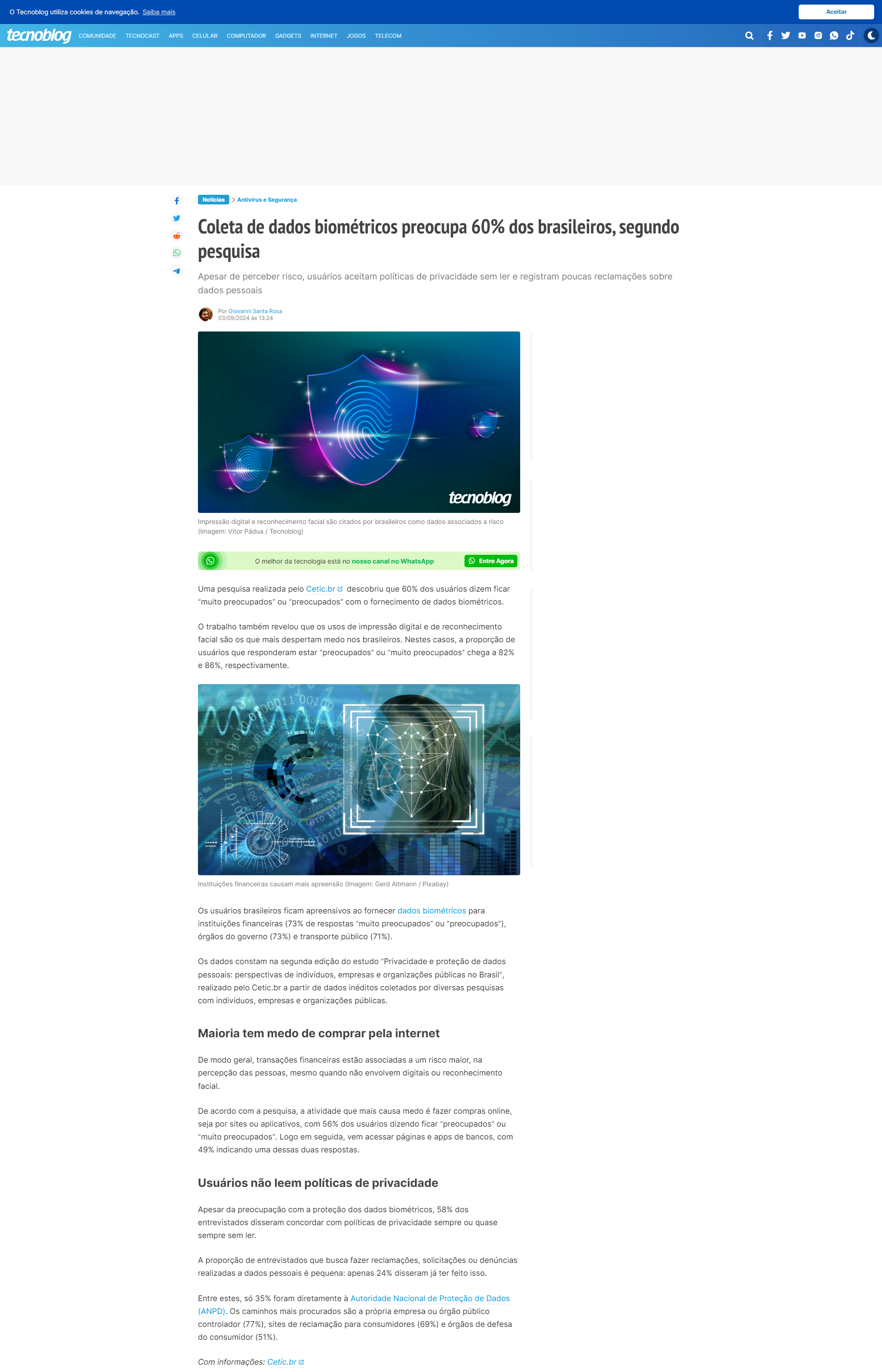 Apesar da preocupação com a proteção dos dados biométricos, 58% dos entrevistados disseram concordar com políticas de privacidade sempre ou quase sempre sem ler.