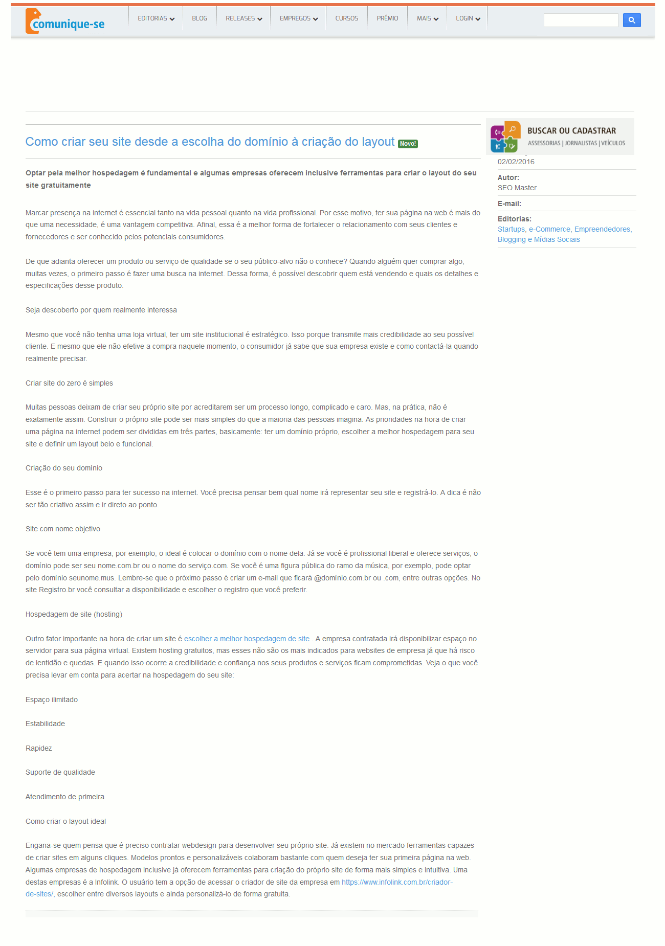 Engana-se quem pensa que é preciso contratar webdesign para desenvolver seu próprio site. Já existem no mercado ferramentas capazes de criar sites em alguns cliques. Modelos prontos e personalizáveis colaboram bastante com quem deseja ter sua primeira página na web. Algumas empresas de hospedagem inclusive já oferecem ferramentas para criação do próprio site de forma mais simples e intuitiva. Uma destas empresas é a Infolink. O usuário tem a opção de acessar o criador de site da empresa em https://www.infolink.com.br/criador-de-sites/, escolher entre diversos layouts e ainda personalizá-lo de forma gratuita.