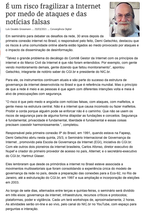 Em seminário para debater os desafios da rede, 30 anos depois da primeira conexão internet no Brasil, o responsável pelo feito, Demi Getschko, destacou que os riscos à uma comunidade online aberta estão ligados ao medo provocado por ataques e o impacto da disseminação de desinformação.