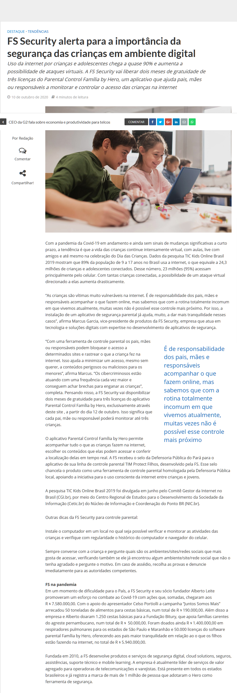 “Com uma ferramenta de controle parental os pais, mães ou responsáveis podem bloquear o acesso a determinados sites e rastrear o que a criança fez na internet. Isso ajuda a minimizar um acesso, mesmo sem querer, a conteúdos perigosos ou maliciosos para os menores”, afirma Marcus. “Os cibercriminosos estão atuando com uma frequência cada vez maior e conseguem achar brechas para enganar as crianças”, completa. Pensando nisso, a FS Security vai disponibilizar dois meses de gratuidade para três licenças do aplicativo Parental Control Família by Hero, exclusivamente através deste site, a partir do dia 12 de outubro. Isso significa que cada pai, mãe ou responsável poderá monitorar até três crianças.