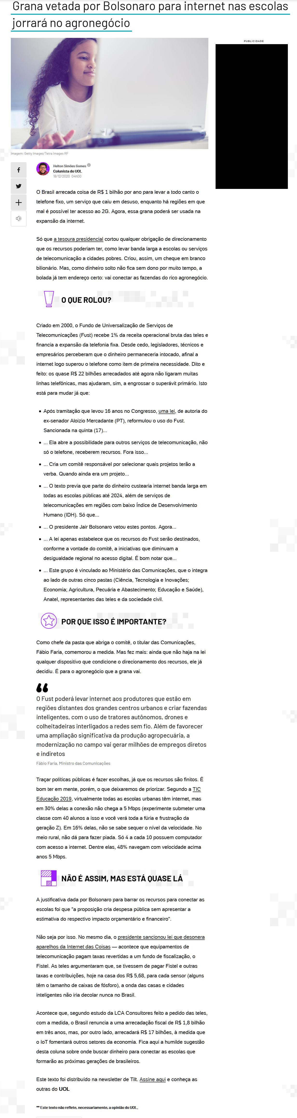 - ... O texto previa que parte do dinheiro custearia internet banda larga em todas as escolas públicas até 2024, além de serviços de telecomunicações em regiões com baixo Índice de Desenvolvimento Humano (IDH). Só que...