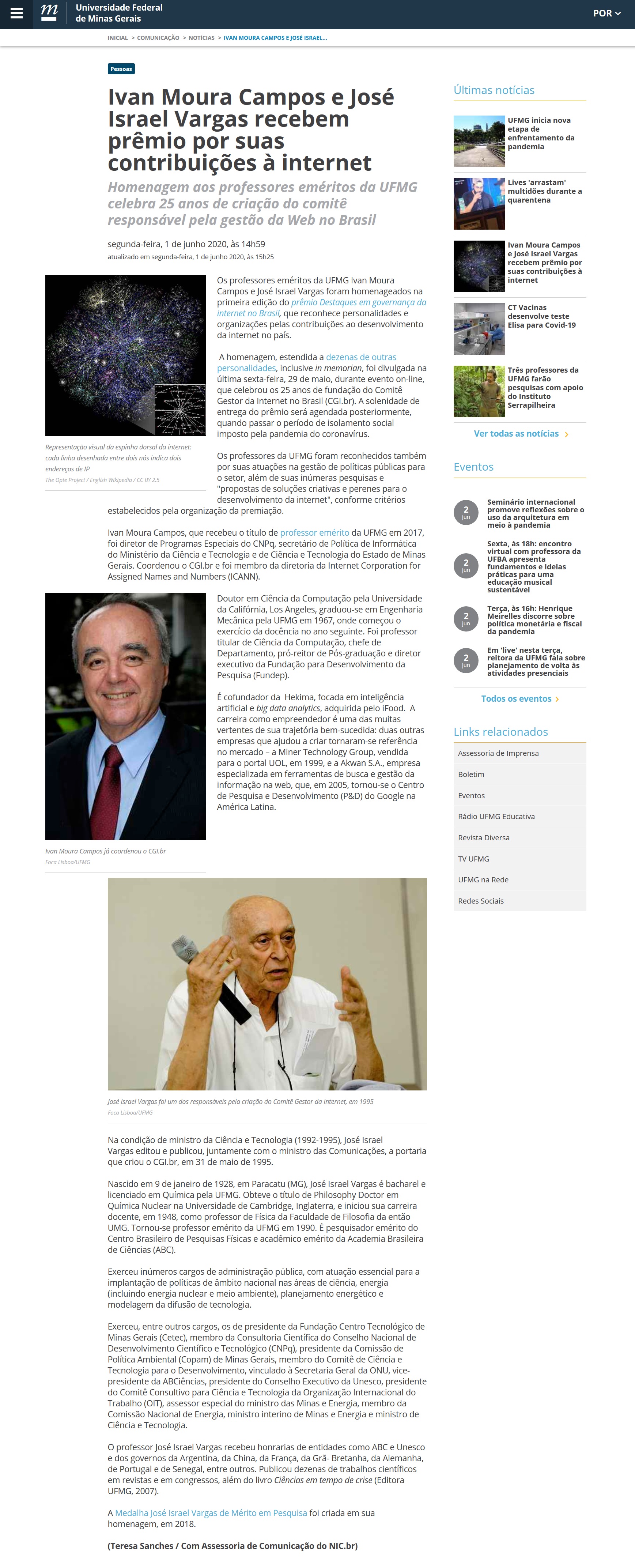 A homenagem, estendida a dezenas de outras personalidades, inclusive in memorian, foi divulgada na última sexta-feira, 29 de maio, durante evento on-line, que celebrou os 25 anos de fundação do Comitê Gestor da Internet no Brasil (CGI.br). A solenidade de entrega do prêmio será agendada posteriormente, quando passar o período de isolamento social imposto pela pandemia do coronavírus.