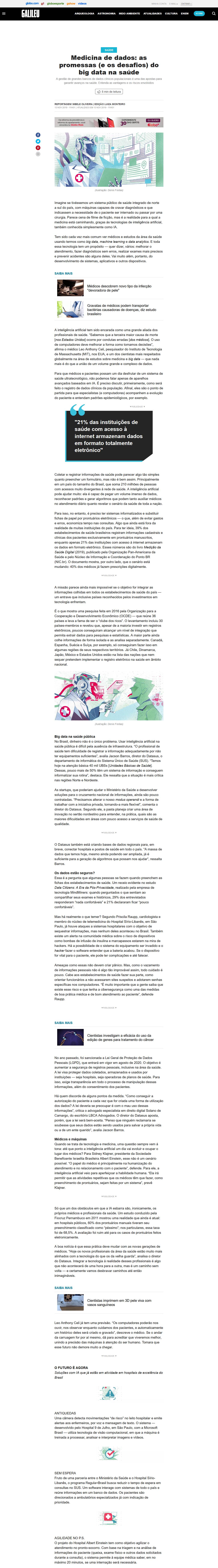 A inteligência artificial tem sido encarada como uma grande aliada dos profissionais de saúde. “Sabemos que a terceira maior causa de morte [nos Estados Unidos] ocorre por condutas erradas [dos médicos]. O uso de computadores deve melhorar a forma como tomamos decisões”, afirma o médico Leo Anthony Celi, pesquisador do Instituto de Tecnologia de Massachusetts (MIT), nos EUA, e um dos cientistas mais respeitados globalmente na área de estudos sobre medicina e big data — que nada mais é do que a união de um volume grande e complexo de dados.