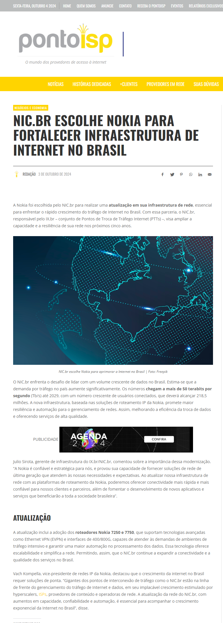 A Nokia foi escolhida pelo NIC.br para realizar uma atualização em sua infraestrutura de rede, essencial para enfrentar o rápido crescimento do tráfego de Internet no Brasil. Com essa parceria, o NIC.br, responsável pelo IX.br – conjunto de Pontos de Troca de Tráfego Internet (PTTs) –, visa ampliar a capacidade e a resiliência de sua rede nos próximos cinco anos.