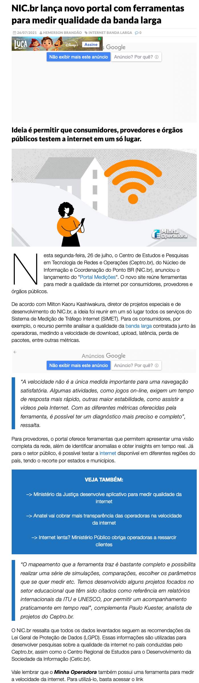 Nesta segunda-feira, 26 de julho, o Centro de Estudos e Pesquisas em Tecnologia de Redes e Operações (Ceptro.br), do Núcleo de Informação e Coordenação do Ponto BR (NIC.br), anunciou o lançamento do “Portal Medições“. O novo site reúne ferramentas para medir a qualidade da internet por consumidores, provedores e órgãos públicos.