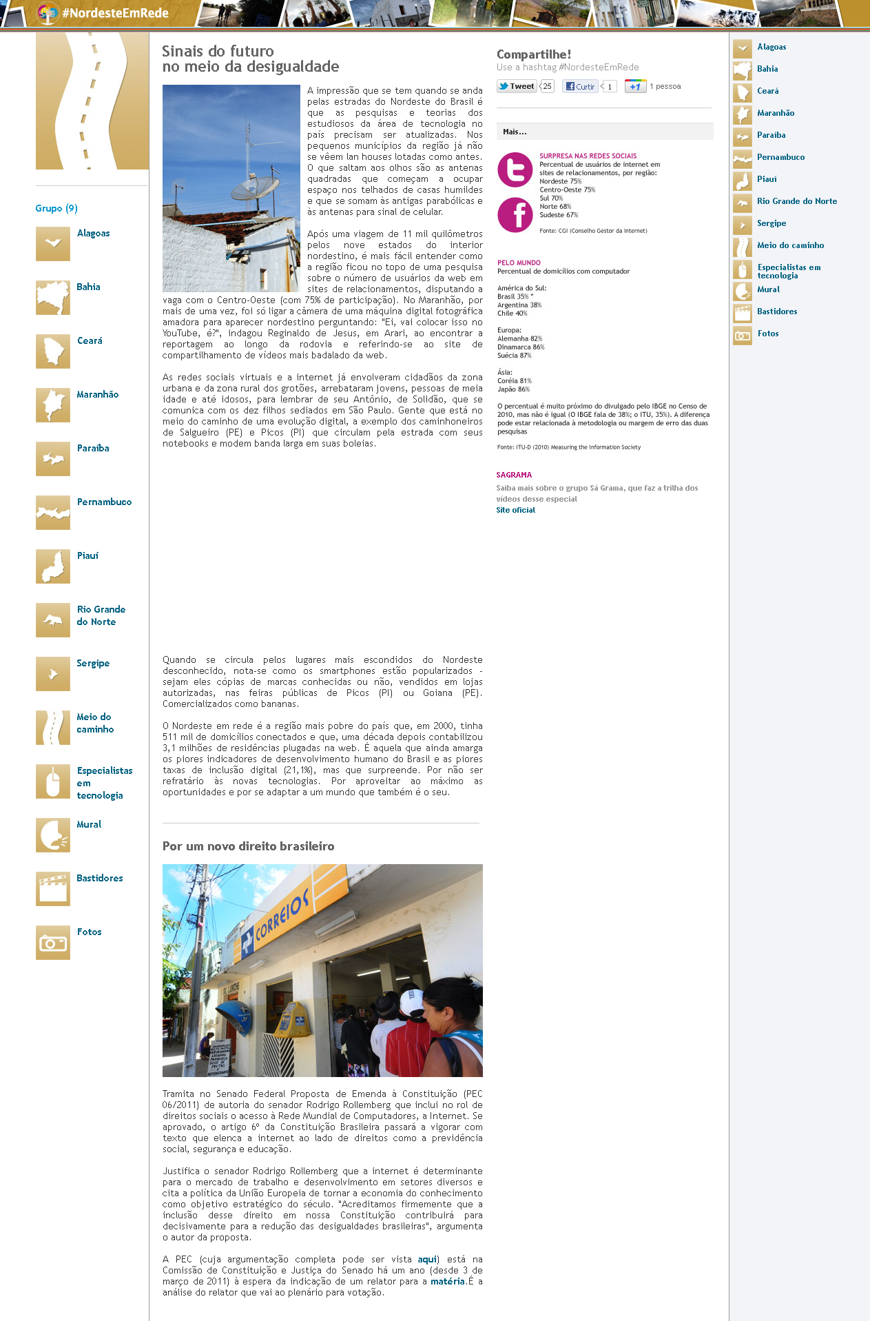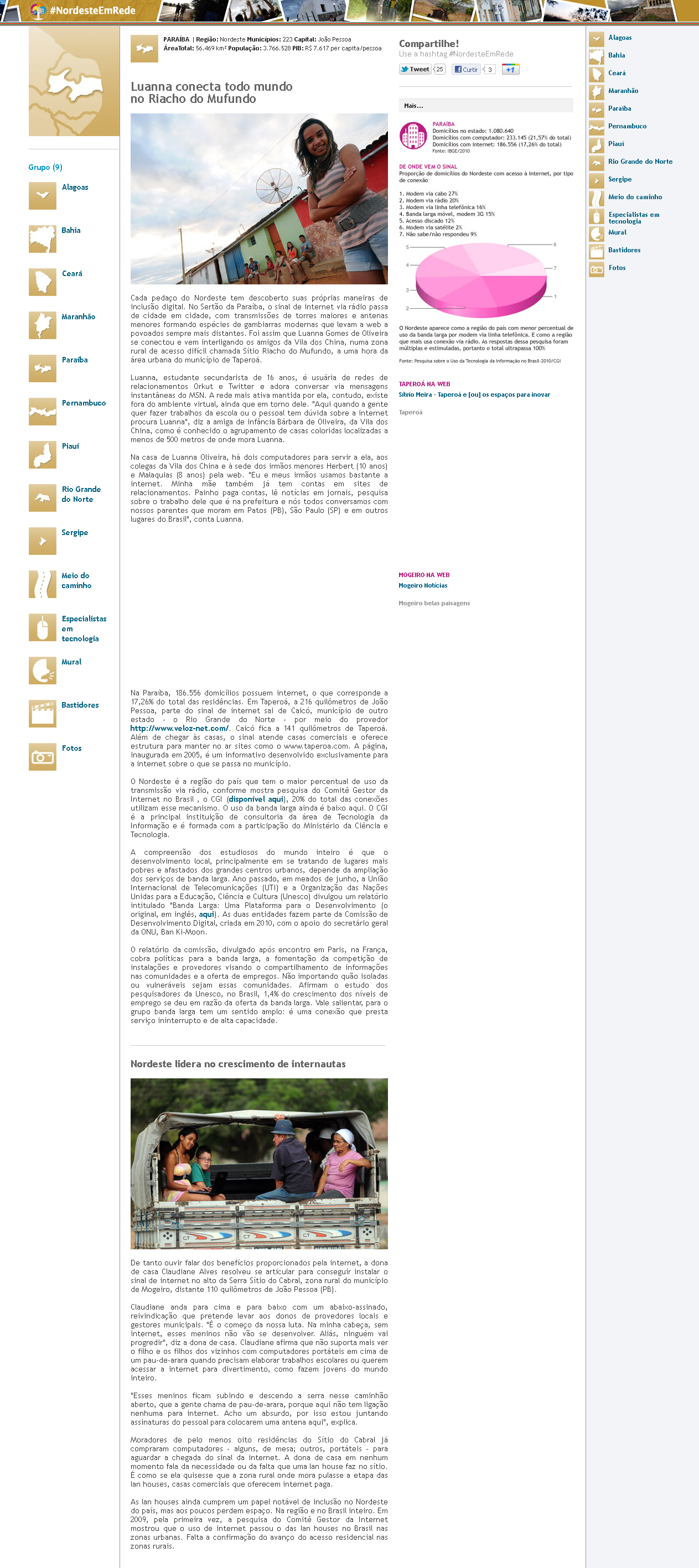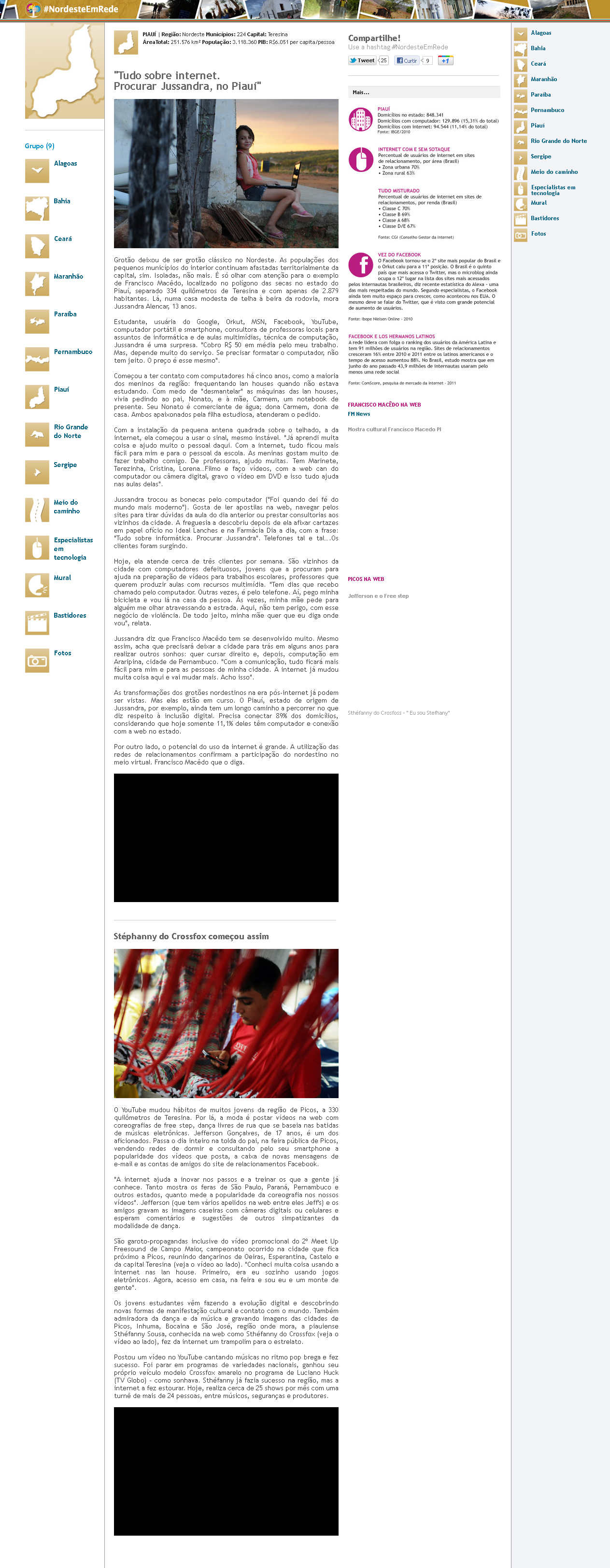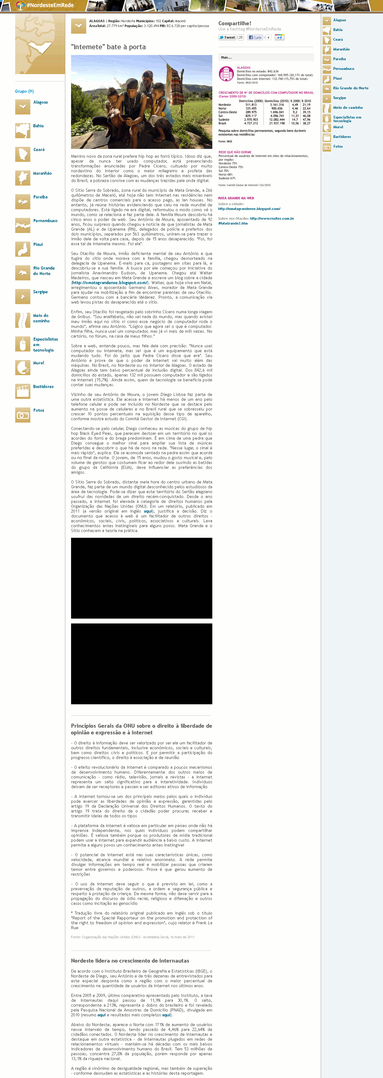 O acesso a computadores, celulares e à web formou redes de comunicação no mundo real. São redes que têm a internet como ferramenta de apoio e que ligam cidadãos em torno de interesses comuns. É um fenômeno novo, estágio avançado da inclusão digital. Investigamos as mudanças provocadas em um lugar que teve quase o dobro do crescimento do número de internautas nos últimos cinco anos. O Nordeste aumentou 213%; o Brasil, 112%, diz o IBGE - embora muitos continuem excluídos. É o mesmo que desponta no topo do ranking de acessos a sites de relacionamentos virtuais (75%). Este especial multimídia mostra a inclusão para além da lan house e do Orkut, Facebook, Twitter, YouTube e outras redes sociais - algo que também já foi popularizado neste território. Gráficos e quadros ilustram o Brasil do qual estamos falando; entrevistas com especialistas e links para estudos fornecem informações extras para os interessados. Textos, vídeos e o mapa das cidades visitadas desvendam nomes e sobrenomes dos que desenham esta nova geografia sociodigital, a nova fronteira das expressivas mudanças que vêm ocorrendo no Nordeste.