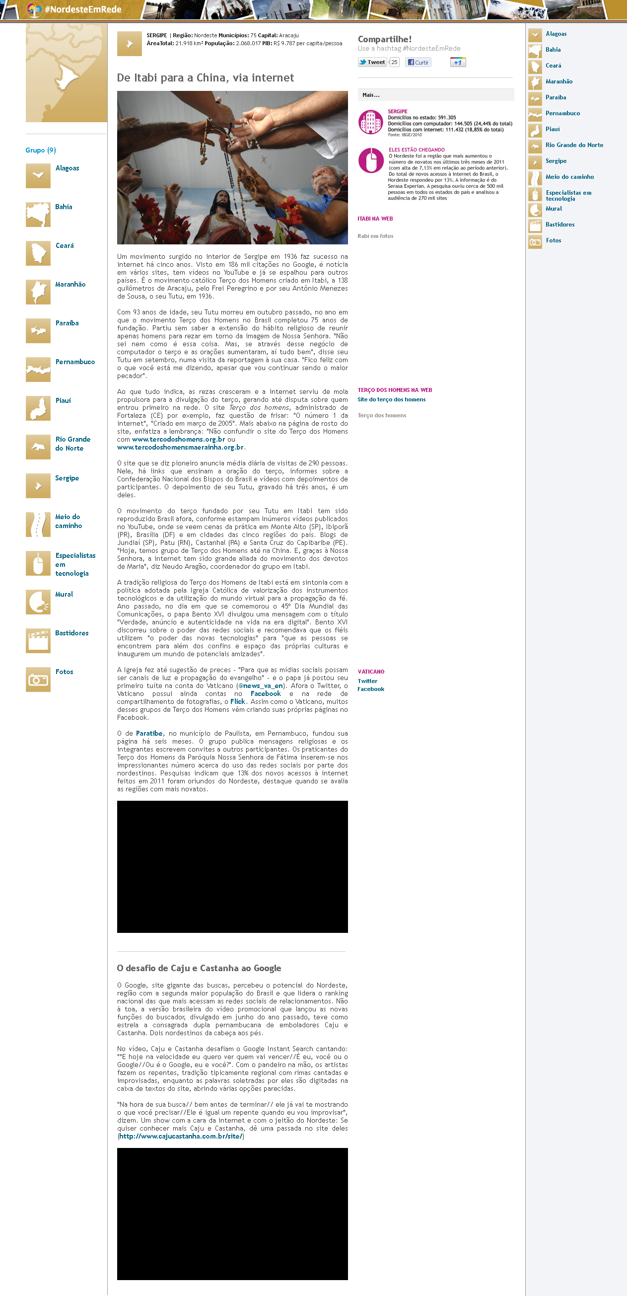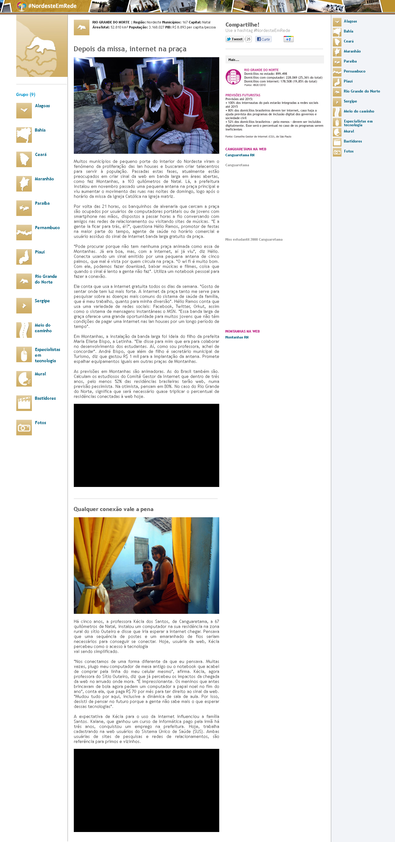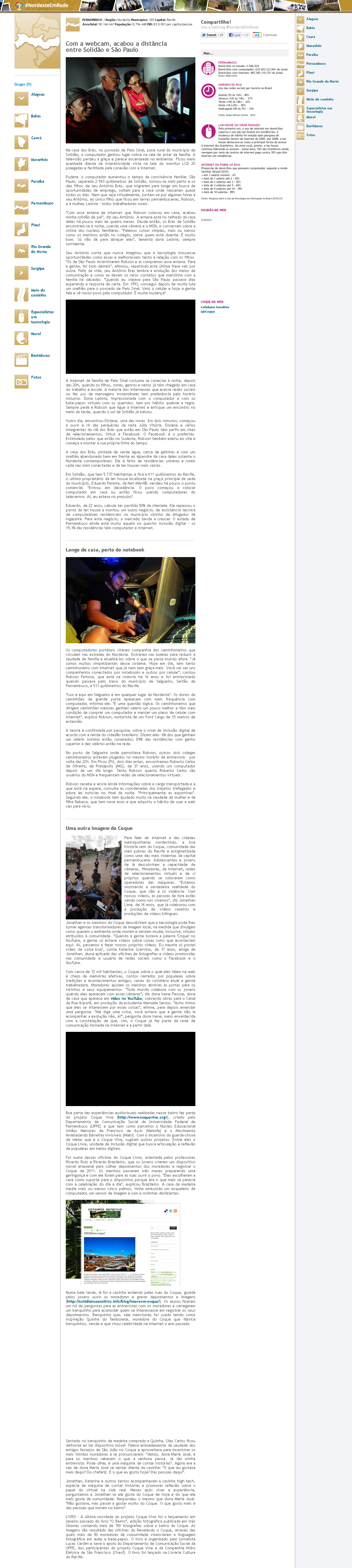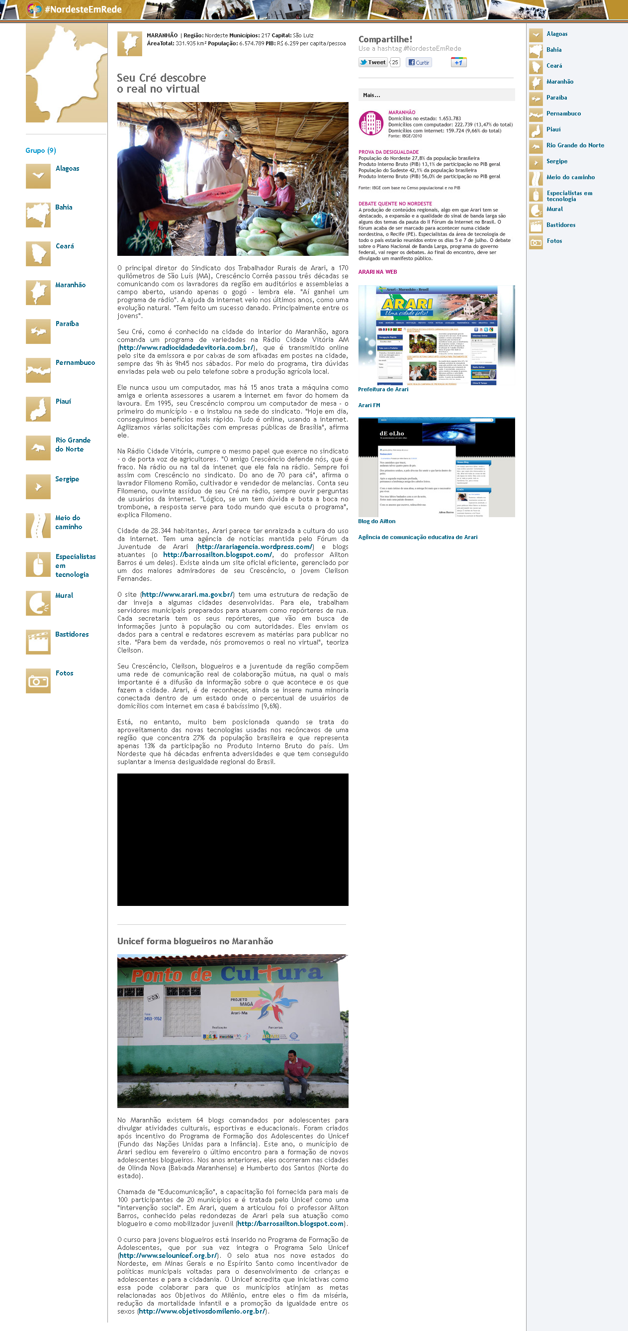 O acesso a computadores, celulares e à web formou redes de comunicação no mundo real. São redes que têm a internet como ferramenta de apoio e que ligam cidadãos em torno de interesses comuns. É um fenômeno novo, estágio avançado da inclusão digital. Investigamos as mudanças provocadas em um lugar que teve quase o dobro do crescimento do número de internautas nos últimos cinco anos. O Nordeste aumentou 213%; o Brasil, 112%, diz o IBGE - embora muitos continuem excluídos. É o mesmo que desponta no topo do ranking de acessos a sites de relacionamentos virtuais (75%). Este especial multimídia mostra a inclusão para além da lan house e do Orkut, Facebook, Twitter, YouTube e outras redes sociais - algo que também já foi popularizado neste território. Gráficos e quadros ilustram o Brasil do qual estamos falando; entrevistas com especialistas e links para estudos fornecem informações extras para os interessados. Textos, vídeos e o mapa das cidades visitadas desvendam nomes e sobrenomes dos que desenham esta nova geografia sociodigital, a nova fronteira das expressivas mudanças que vêm ocorrendo no Nordeste.