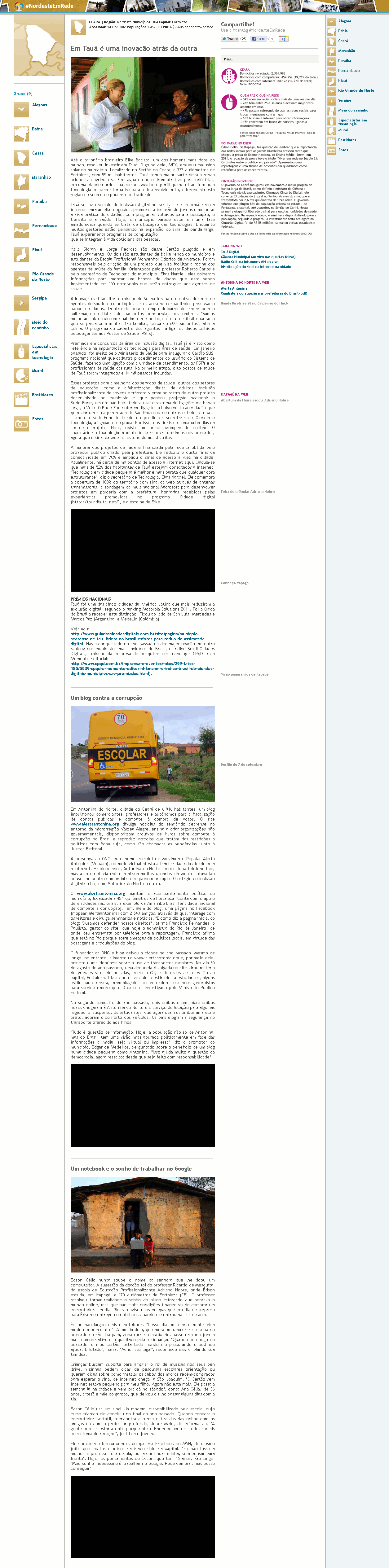 http://www.guiadascidadesdigitais.com.br/site/pagina/municpio-cearense-de-tau- lidera-no-brasil-esforos-para-reduo-de-assimetria-digital. Havia conquistado no ano passado a décima colocação em outro ranking dos municípios mais incluídos do Brasil, o Índice Brasil Cidades Digitais, trabalho da empresa de pesquisas em tecnologia CPqD e da Momento Editorial: