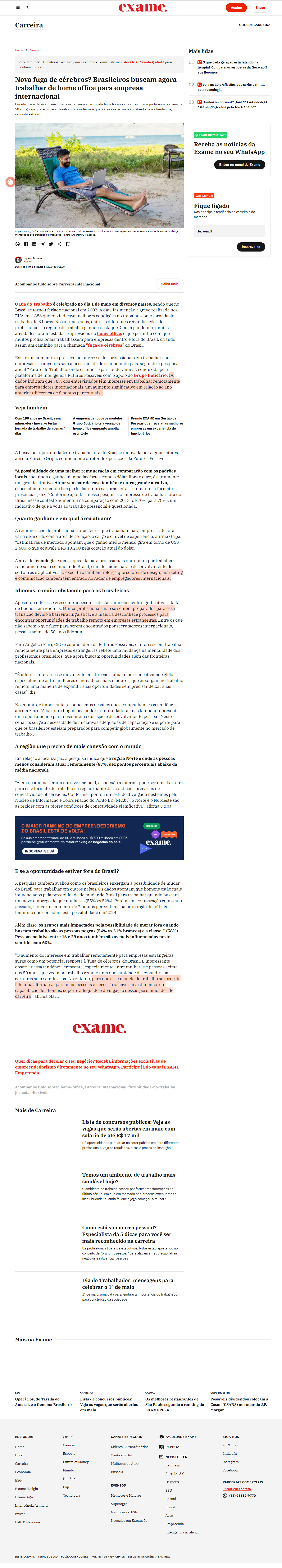 "O aumento do interesse em trabalhar remotamente para empresas estrangeiras surge como um potencial resposta à 'fuga de cérebros' do Brasil. É interessante observar essa tendência crescente, especialmente entre mulheres e pessoas acima dos 50 anos, que veem no trabalho remoto uma oportunidade de expandir suas carreiras sem sair de casa. No entanto, para que esse modelo de trabalho se torne de fato uma alternativa para mais pessoas é necessário haver investimentos em capacitação de idiomas, suporte adequado e divulgação dessas possibilidades de carreira”, afirma Mari.