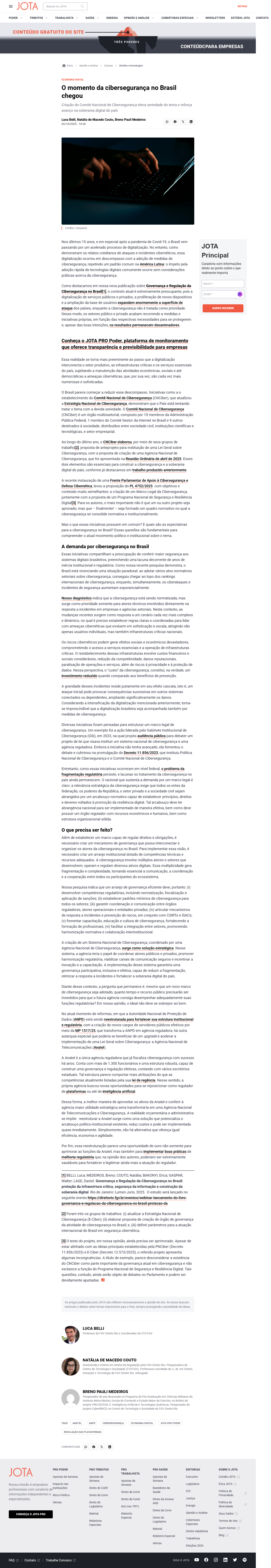 [1] BELLI, Luca; MEDEIROS, Breno; COUTO, Natália; BAKONYI, Erica; GASPAR, Walter; LAGE, Daniel. Governança e Regulação da Cibersegurança no Brasil: proteção da infraestrtura crítica, segurança da informação e construção da soberania digital. Rio de Janeiro: Lumen Juris, 2025. O estudo será lançado no seguinte evento https://direitorio.fgv.br/eventos/webinar-lancamento-do-livro-governanca-e-regulacao-da-ciberseguranca-no-brasil-protecao-da