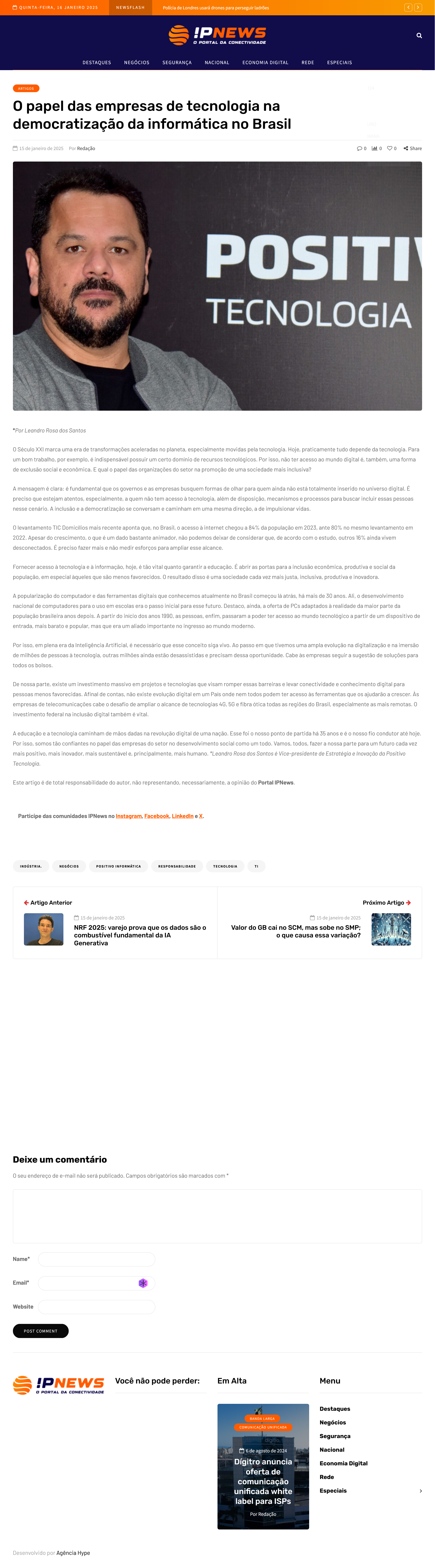 A educação e a tecnologia caminham de mãos dadas na revolução digital de uma nação. Esse foi o nosso ponto de partida há 35 anos e é o nosso fio condutor até hoje. Por isso, somos tão confiantes no papel das empresas do setor no desenvolvimento social como um todo. Vamos, todos, fazer a nossa parte para um futuro cada vez mais positivo, mais inovador, mais sustentável e, principalmente, mais humano. *Leandro Rosa dos Santos é Vice-presidente de Estratégia e Inovação da Positivo Tecnologia.