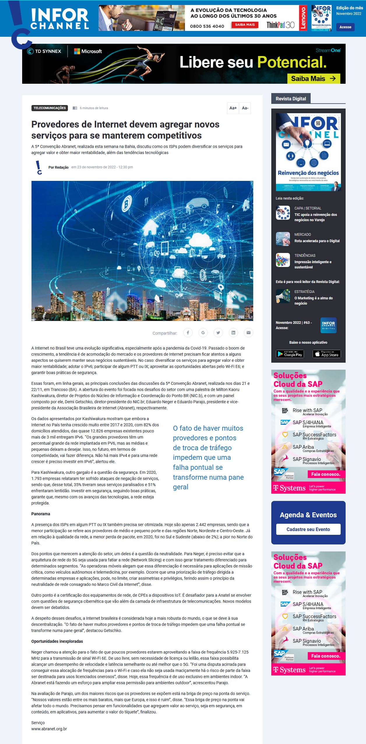 A Internet no Brasil teve uma evolução significativa, especialmente após a pandemia da Covid-19. Passado o boom de crescimento, a tendência é de acomodação do mercado e os provedores de Internet precisam ficar atentos a alguns aspectos se quiserem manter seus negócios sustentáveis. No caso: diversificar os serviços para agregar valor e obter maior rentabilidade; adotar o IPv6; participar de algum PTT ou IX; aproveitar as oportunidades abertas pelo Wi-Fi E6; e garantir boas práticas de segurança.