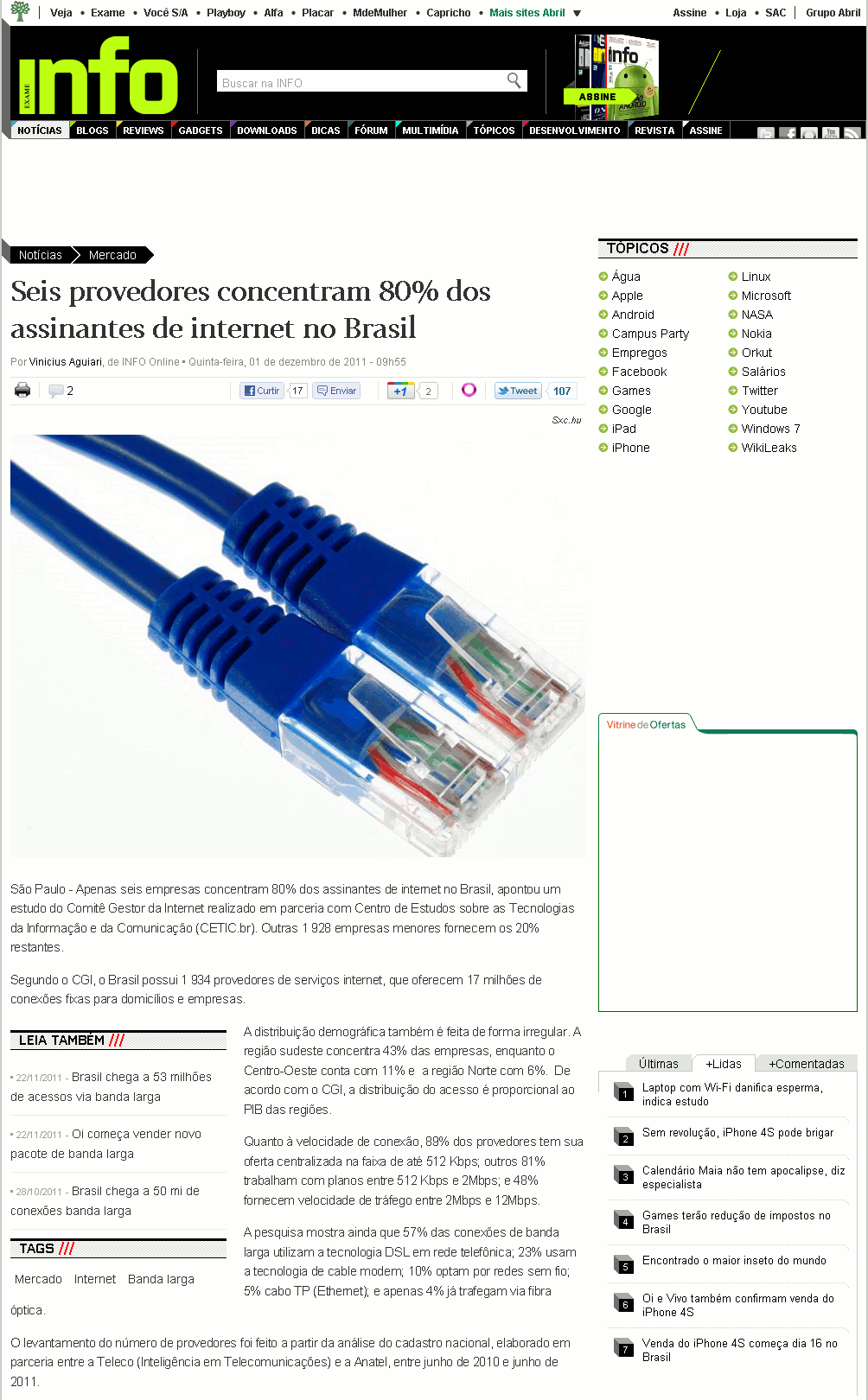 Apenas seis empresas concentram 80% dos assinantes de internet no Brasil, apontou um estudo do Comitê Gestor da Internet realizado em parceria com Centro de Estudos sobre as Tecnologias da Informação e da Comunicação (CETIC.br). Outras 1 928 empresas menores fornecem os 20% restantes.
