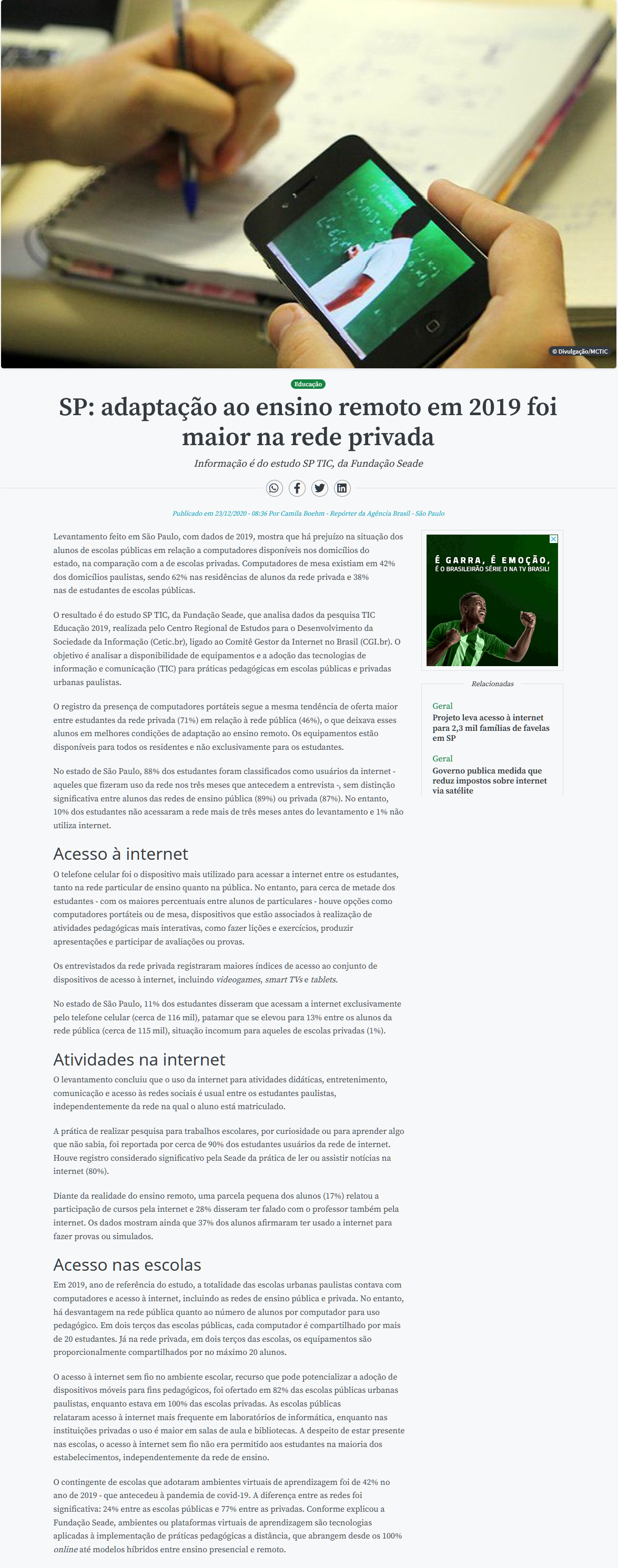 Levantamento feito em São Paulo, com dados de 2019, mostra que há prejuízo na situação dos alunos de escolas públicas em relação a computadores disponíveis nos domicílios do estado, na comparação com a de escolas privadas. Computadores de mesa existiam em 42% dos domicílios paulistas, sendo 62% nas residências de alunos da rede privada e 38% nas de estudantes de escolas públicas.