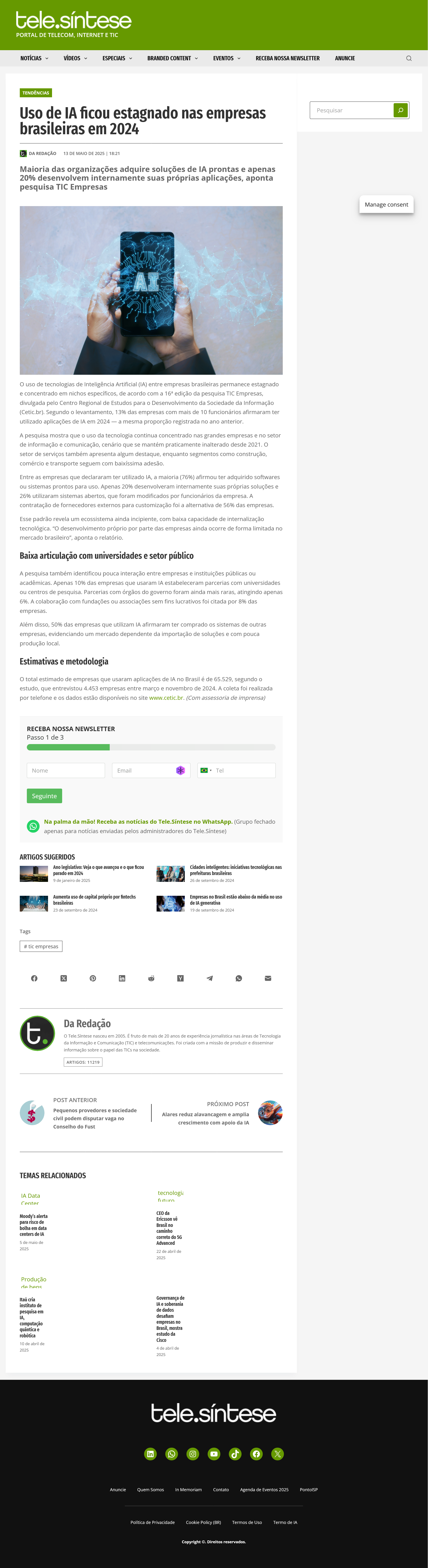 O total estimado de empresas que usaram aplicações de IA no Brasil é de 65.529, segundo o estudo, que entrevistou 4.453 empresas entre março e novembro de 2024. A coleta foi realizada por telefone e os dados estão disponíveis no site www.cetic.br. (Com assessoria de imprensa)