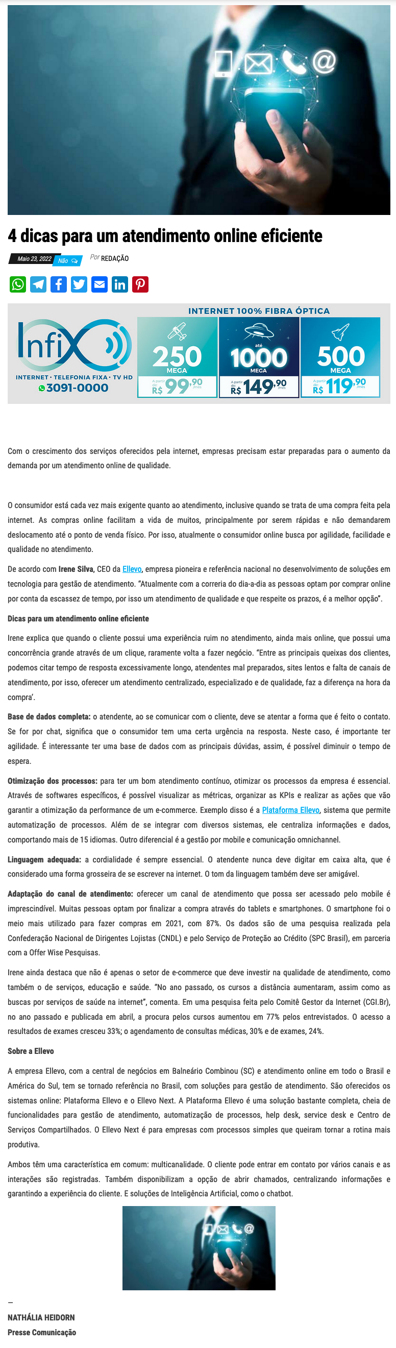 De acordo com Irene Silva, CEO da Ellevo, empresa pioneira e referência nacional no desenvolvimento de soluções em tecnologia para gestão de atendimento. "Atualmente com a correria do dia-a-dia as pessoas optam por comprar online por conta da escassez de tempo, por isso um atendimento de qualidade e que respeite os prazos, é a melhor opção".