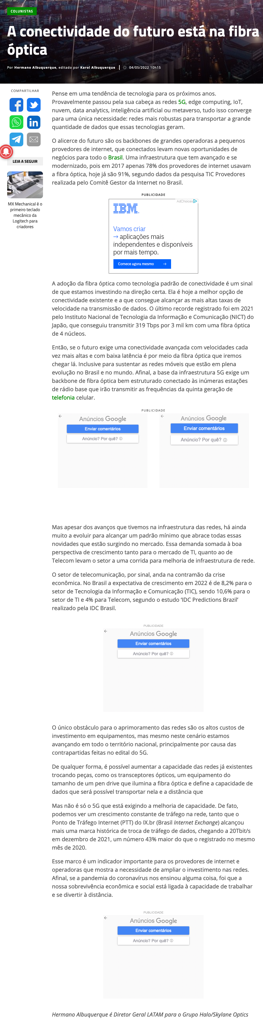 A adoção da fibra óptica como tecnologia padrão de conectividade é um sinal de que estamos investindo na direção certa. Ela é hoje a melhor opção de conectividade existente e a que consegue alcançar as mais altas taxas de velocidade na transmissão de dados. O último recorde registrado foi em 2021 pelo Instituto Nacional de Tecnologia da Informação e Comunicação (NICT) do Japão, que conseguiu transmitir 319 Tbps por 3 mil km com uma fibra óptica de 4 núcleos.