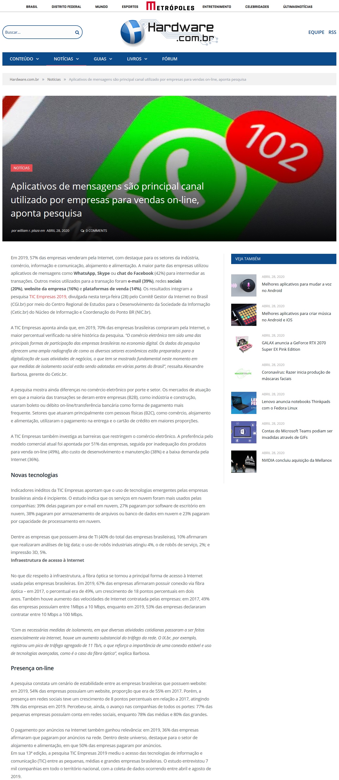 Em 2019, 57% das empresas venderam pela Internet, com destaque para os setores da indústria, comércio, informação e comunicação, alojamento e alimentação. A maior parte das empresas utilizou aplicativos de mensagens como WhatsApp, Skype ou chat do Facebook (42%) para intermediar as transações. Outros meios utilizados para a transação foram e-mail (39%), redes sociais (20%), website da empresa (16%) e plataformas de venda (14%). Os resultados integram a pesquisa TIC Empresas 2019, divulgada nesta terça-feira (28) pelo Comitê Gestor da Internet no Brasil (CGI.br) por meio do Centro Regional de Estudos para o Desenvolvimento da Sociedade da Informação (Cetic.br) do Núcleo de Informação e Coordenação do Ponto BR (NIC.br).
