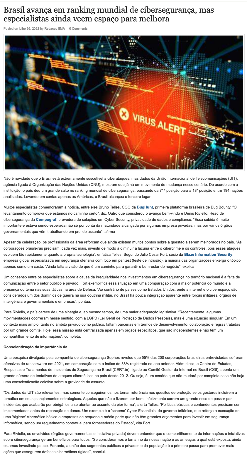 Muitos especialistas comemoraram a notícia, entre eles Bruno Telles, COO da BugHunt, primeira plataforma brasileira de Bug Bounty. “O levantamento comprova que estamos no caminho certo”, diz. Outro que considerou o avanço bem-vindo é Denis Riviello, Head de cibersegurança da Compugraf, provedora de soluções em Cyber Security, privacidade de dados e compliance. “Essa subida é muito importante e estava sendo esperada não só por conta da maturidade alcançada por algumas empresa privadas, mas por vários órgãos governamentais que vêm trabalhando em prol do assunto”, afirma