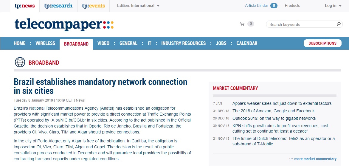 Braziil's National Telecommunications Agency (Anatel) has established an obligation for providers with significant market power to provide a direct connection at Traffic Exchange Points (PTTs) operated by IX.br/NIC.br/CGI.br in six cities. According to the act published in the Official Gazette, the decision establishes that in Oporto, Rio de Janeiro, Brasilia and Fortaleza, the providers Oi, Vivo, Claro, TIM and Algar should provide connections.