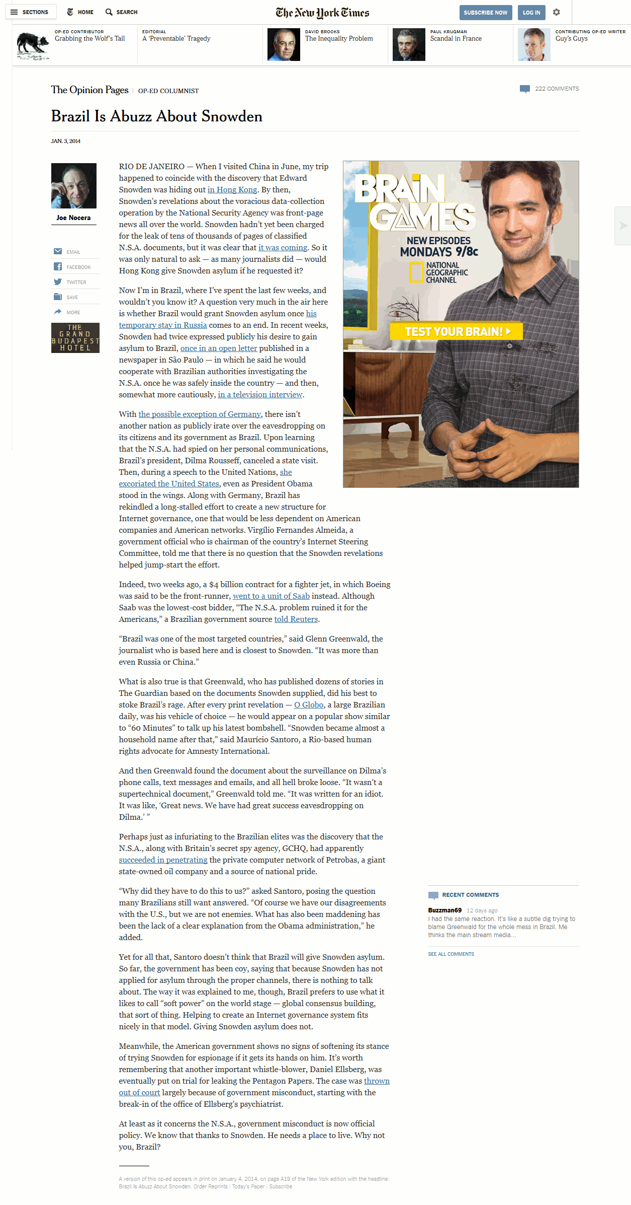 What is also true is that Greenwald, who has published dozens of stories in The Guardian based on the documents Snowden supplied, did his best to stoke Brazil’s rage. After every print revelation — O Globo, a large Brazilian daily, was his vehicle of choice — he would appear on a popular show similar to “60 Minutes” to talk up his latest bombshell. “Snowden became almost a household name after that,” said Maurício Santoro, a Rio-based human rights advocate for Amnesty International.