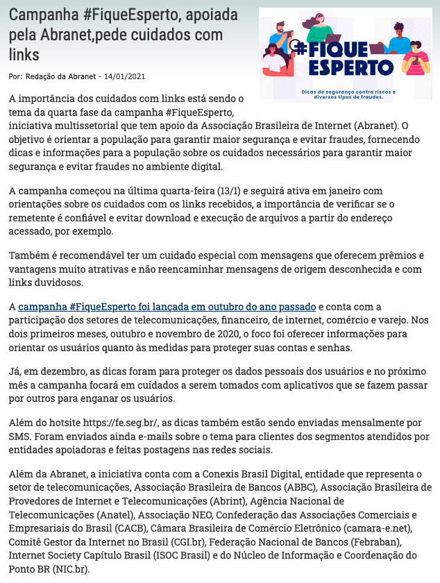 A importância dos cuidados com links está sendo o tema da quarta fase da campanha #FiqueEsperto, iniciativa multissetorial que tem apoio da Associação Brasileira de Internet (Abranet). O objetivo é orientar a população para garantir maior segurança e evitar fraudes, fornecendo dicas e informações para a população sobre os cuidados necessários para garantir maior segurança e evitar fraudes no ambiente digital.