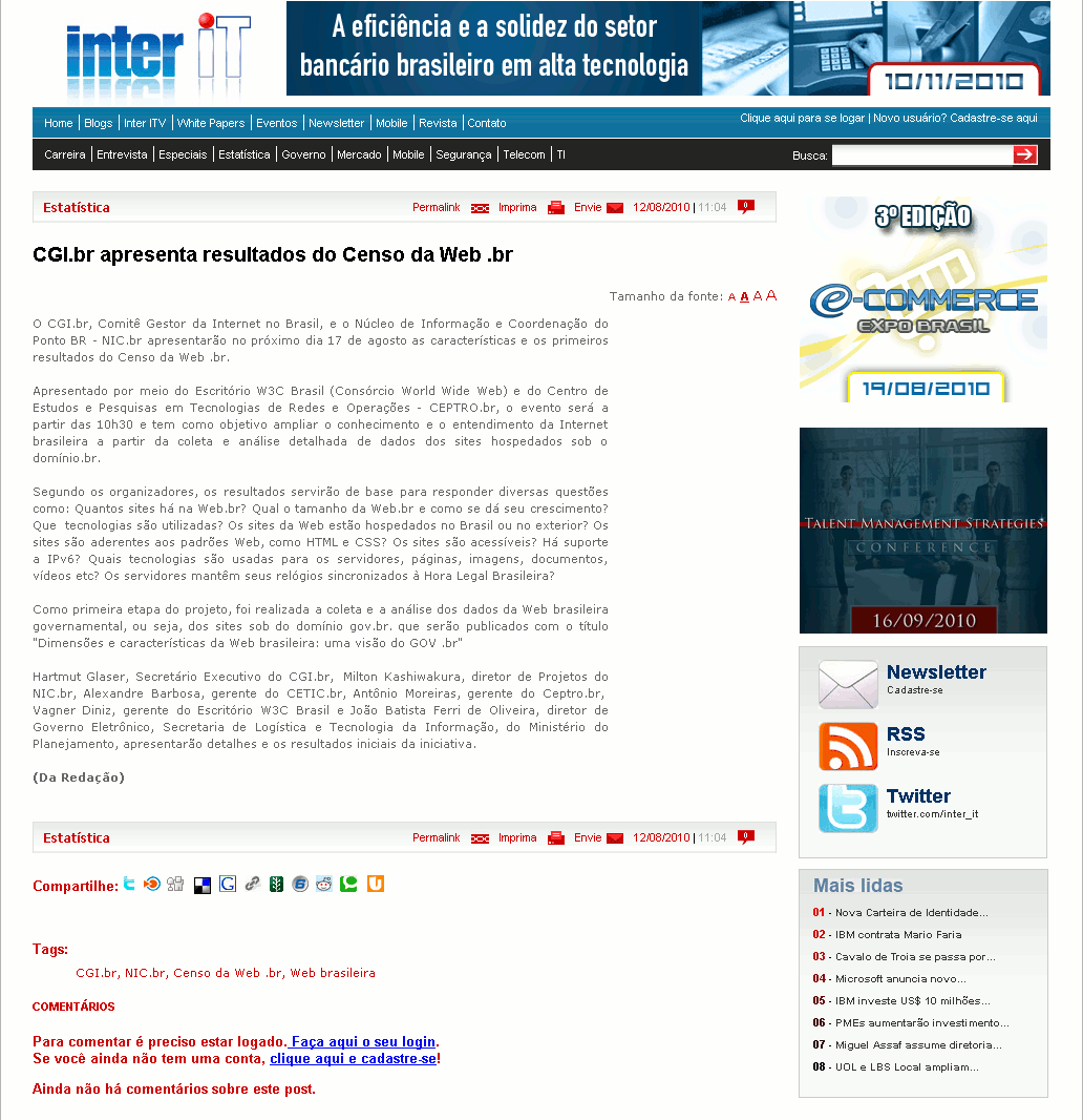O CGI.br, Comitê Gestor da Internet no Brasil, e o Núcleo de Informação e Coordenação do Ponto BR - NIC.br apresentarão no próximo dia 17 de agosto as características e os primeiros resultados do Censo da Web .br.