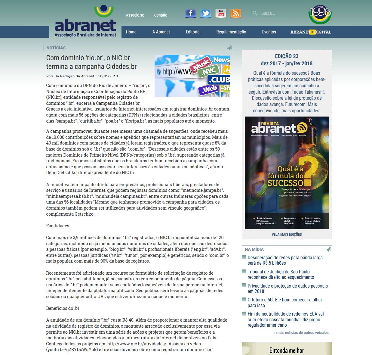 Com o anúncio do DPN do Rio de Janeiro – "rio.br", o Núcleo de Informação e Coordenação do Ponto BR (NIC.br), entidade responsável pelo registro de domínios ".br", encerra a Campanha Cidades.br. Graças a esta iniciativa, usuários de Internet interessados em registrar domínios .br contam agora com mais 56 opções de categorias (DPNs) relacionadas a cidades brasileiras, entre elas "sampa.br", "curitiba.br", "poa.br" e "floripa.br", as mais populares até o momento.