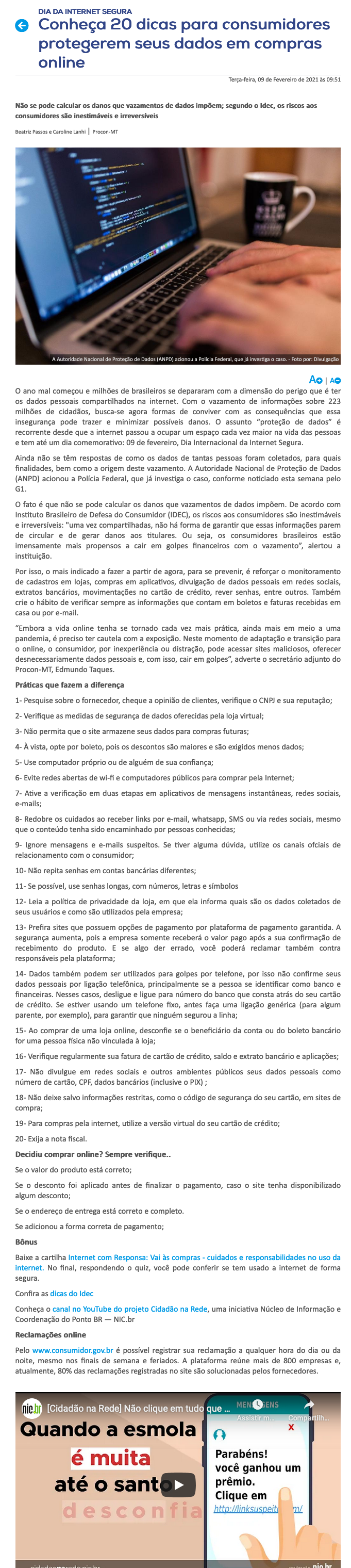“Embora a vida online tenha se tornado cada vez mais prática, ainda mais em meio a uma pandemia, é preciso ter cautela com a exposição. Neste momento de adaptação e transição para o online, o consumidor, por inexperiência ou distração, pode acessar sites maliciosos, oferecer desnecessariamente dados pessoais e, com isso, cair em golpes”, adverte o secretário adjunto do Procon-MT, Edmundo Taques.