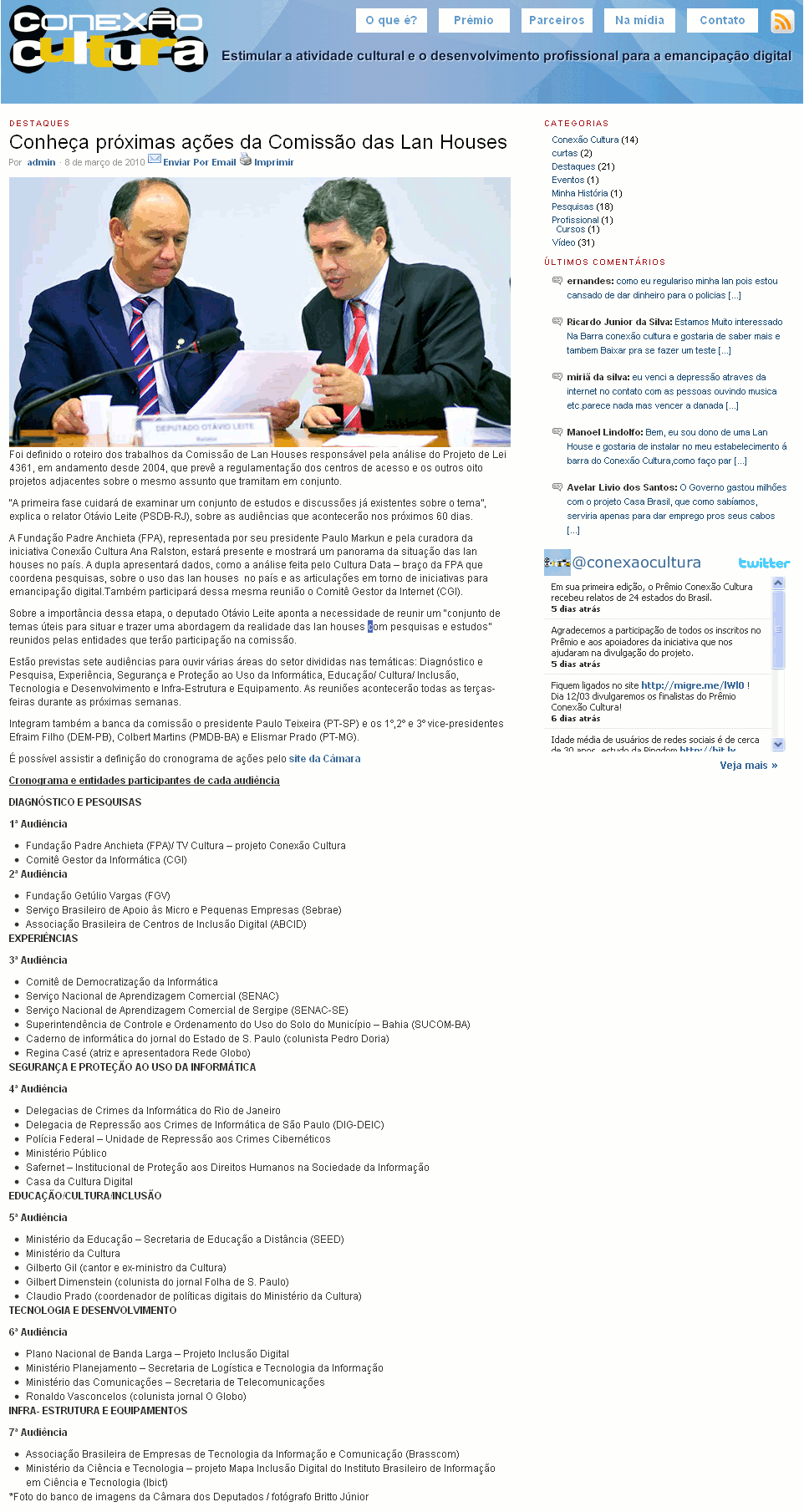 A Fundação Padre Anchieta (FPA), representada por seu presidente Paulo Markun e pela curadora da iniciativa Conexão Cultura Ana Ralston, estará presente e mostrará um panorama da situação das lan houses no país. A dupla apresentará dados, como a análise feita pelo Cultura Data – braço da FPA que coordena pesquisas, sobre o uso das lan houses no país e as articulações em torno de iniciativas para emancipação digital.Também participará dessa mesma reunião o Comitê Gestor da Internet (CGI).