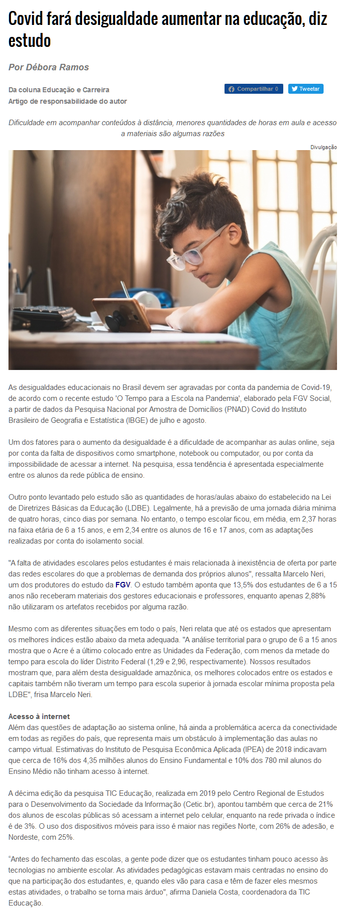 "A falta de atividades escolares pelos estudantes é mais relacionada à inexistência de oferta por parte das redes escolares do que a problemas de demanda dos próprios alunos", ressalta Marcelo Neri, um dos produtores do estudo da FGV. O estudo também aponta que 13,5% dos estudantes de 6 a 15 anos não receberam materiais dos gestores educacionais e professores, enquanto apenas 2,88% não utilizaram os artefatos recebidos por alguma razão.
