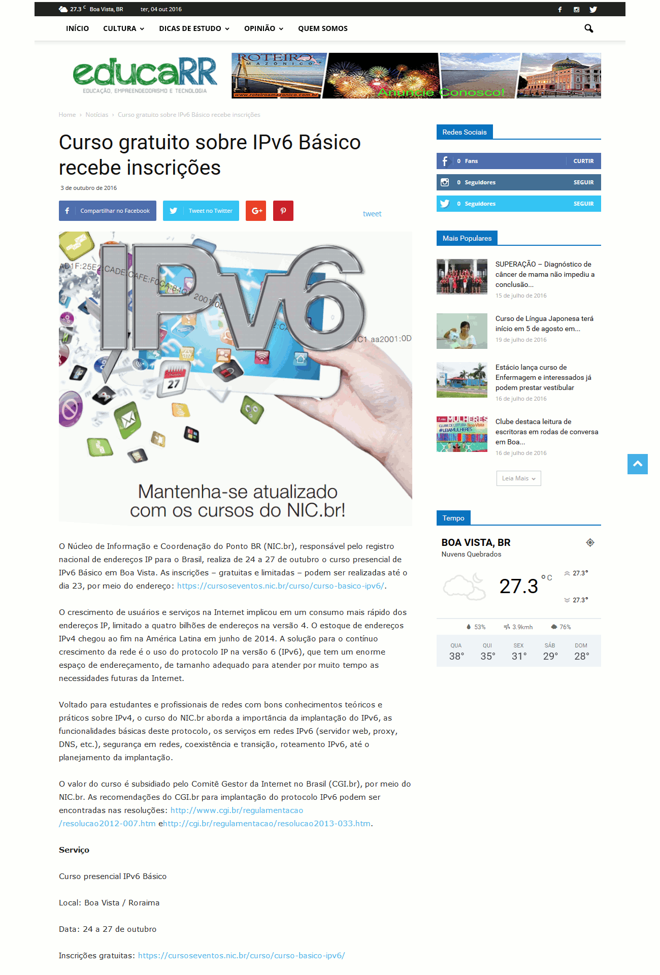 O Núcleo de Informação e Coordenação do Ponto BR (NIC.br), responsável pelo registro nacional de endereços IP para o Brasil, realiza de 24 a 27 de outubro o curso presencial de IPv6 Básico em Boa Vista. As inscrições – gratuitas e limitadas – podem ser realizadas até o dia 23, por meio do endereço: https://cursoseventos.nic.br/curso/curso-basico-ipv6/.