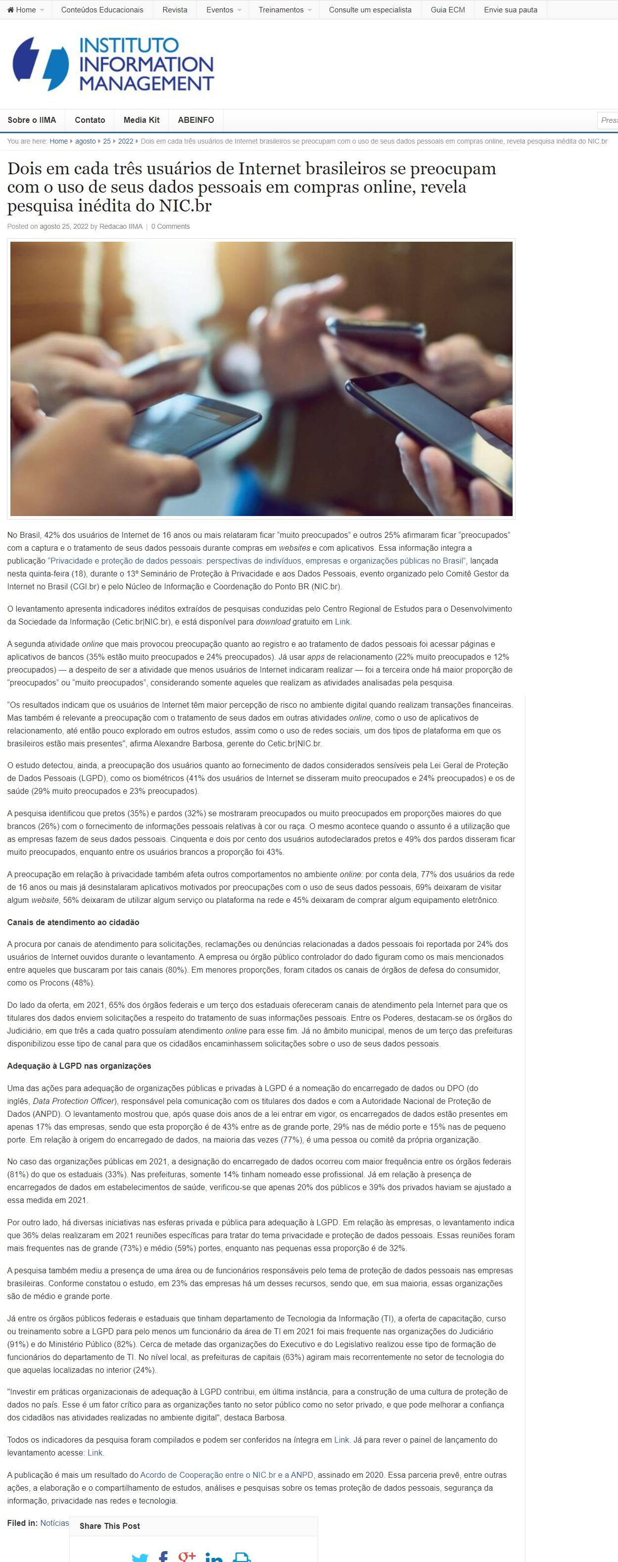 No Brasil, 42% dos usuários de Internet de 16 anos ou mais relataram ficar “muito preocupados” e outros 25% afirmaram ficar “preocupados” com a captura e o tratamento de seus dados pessoais durante compras em websites e com aplicativos. Essa informação integra a publicação “Privacidade e proteção de dados pessoais: perspectivas de indivíduos, empresas e organizações públicas no Brasil”, lançada nesta quinta-feira (18), durante o 13º Seminário de Proteção à Privacidade e aos Dados Pessoais, evento organizado pelo Comitê Gestor da Internet no Brasil (CGI.br) e pelo Núcleo de Informação e Coordenação do Ponto BR (NIC.br).