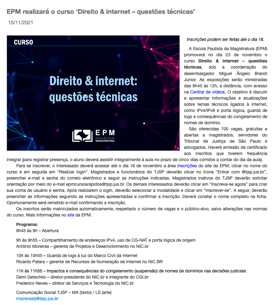 A Escola Paulista da Magistratura (EPM) promoverá no dia 23 de novembro o curso Direito & internet – questões técnicas, sob a coordenação do desembargador Miguel Ângelo Brandi Junior. As exposições serão ministradas das 8h45 às 12h, a distância, com acesso na Central de vídeos. O objetivo é discutir e apresentar informações e atualizações sobre temas técnicos ligados à internet, como IPv4/IPv6 e porta lógica, guarda de logs e consequências do congelamento de nomes de domínio.