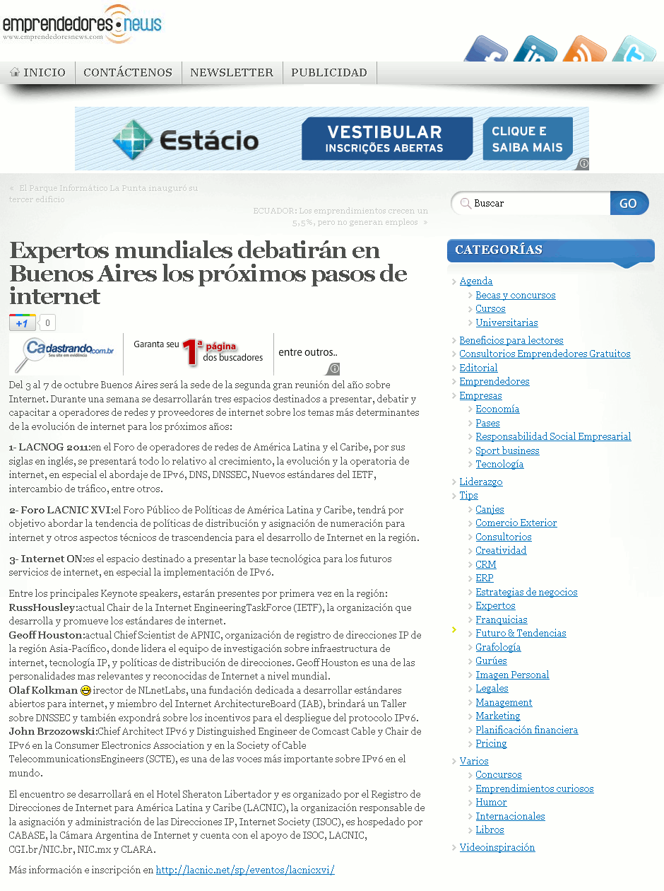 1- LACNOG 2011:en el Foro de operadores de redes de América Latina y el Caribe, por sus siglas en inglés, se presentará todo lo relativo al crecimiento, la evolución y la operatoria de internet, en especial el abordaje de IPv6, DNS, DNSSEC, Nuevos estándares del IETF, intercambio de tráfico, entre otros.