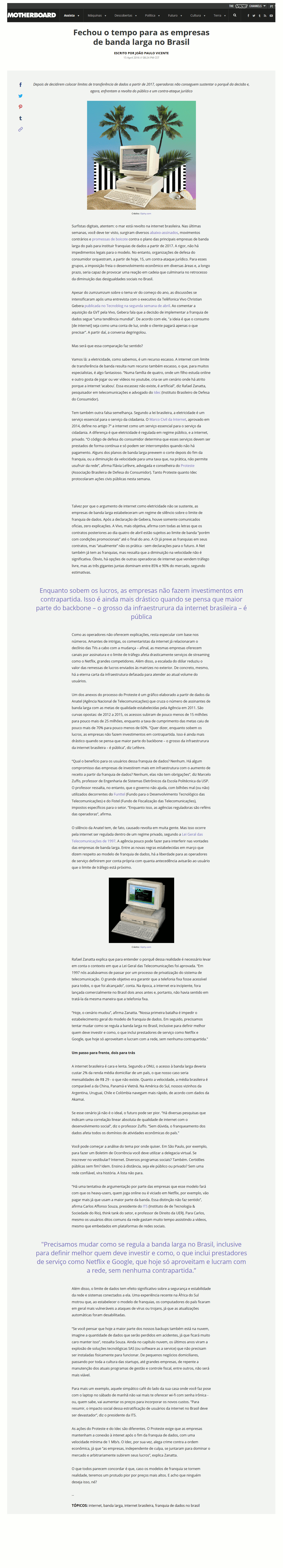 “Hoje, o cenário mudou”, afirma Zanatta. “Nossa primeira batalha é impedir o estabelecimento geral do modelo de franquia de dados. Em seguido, precisamos tentar mudar como se regula a banda larga no Brasil, inclusive para definir melhor quem deve investir e como, o que inclui prestadores de serviço como Netflix e Google, que hoje só aproveitam e lucram com a rede, sem nenhuma contrapartida.”