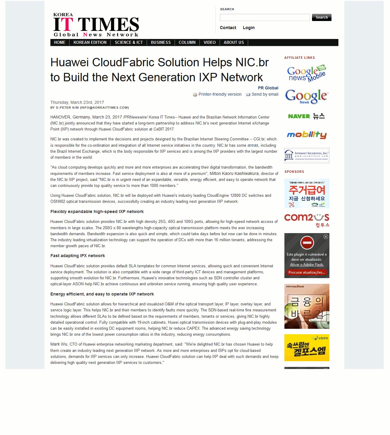 HANOVER, Germany, March 23, 2017 /PRNewswire/ Korea IT Times-- Huawei and the Brazilian Network Information Center (NIC.br) jointly announced that they have started a long-term partnership to address NIC.br's next generation Internet eXchange Point (IXP) network through Huawei CloudFabric solution at CeBIT 2017.