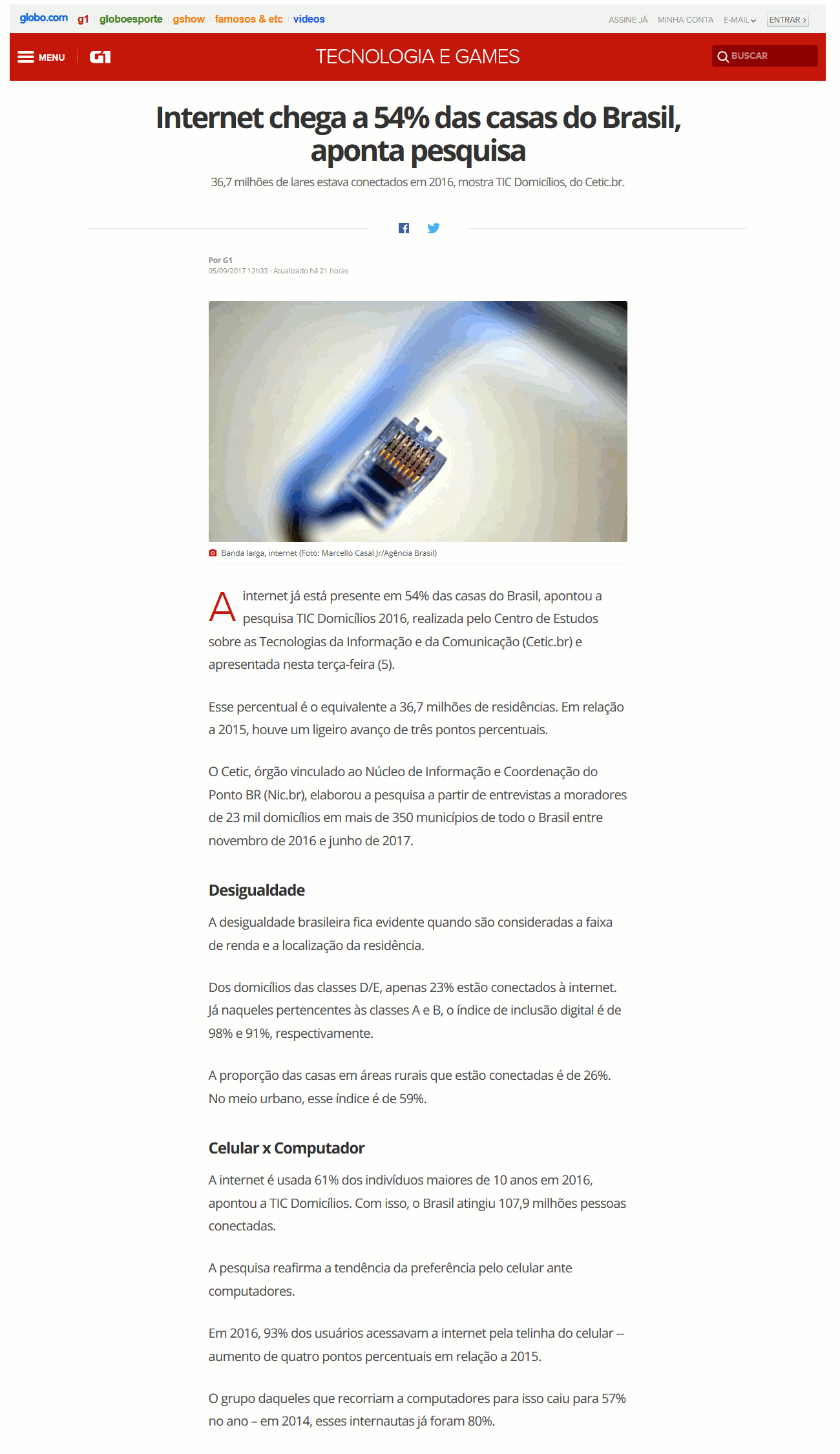 A internet já está presente em 54% das casas do Brasil, apontou a pesquisa TIC Domicílios 2016, realizada pelo Centro de Estudos sobre as Tecnologias da Informação e da Comunicação (Cetic.br) e apresentada nesta terça-feira (5).