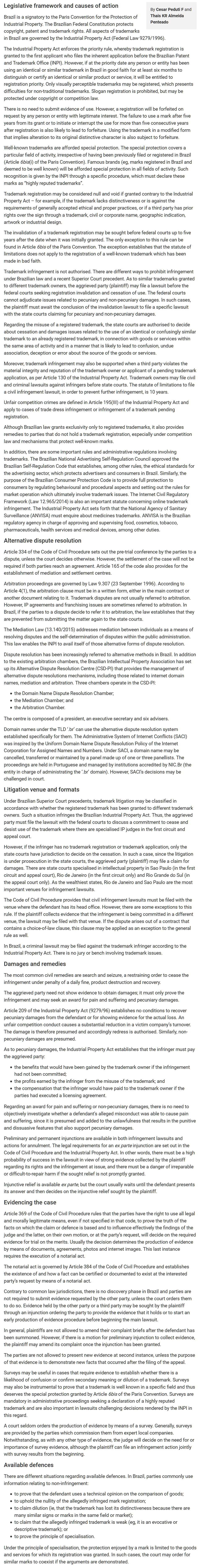 Surveys may be useful in cases that require evidence to establish whether there is a likelihood of confusion or confirm secondary meaning or dilution of a trademark. Surveys may also be instrumental to prove that a trademark is well known in a specific field and thus deserves the special protection granted by Article 6bis of the Paris Convention. Surveys are mandatory in administrative proceedings seeking a declaration of a highly reputed trademark and are also important in lawsuits challenging decisions rendered by the INPI in this regard.