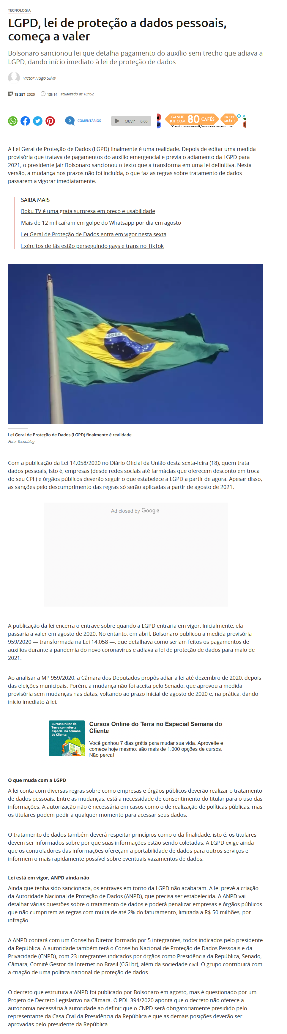 A publicação da lei encerra o entrave sobre quando a LGPD entraria em vigor. Inicialmente, ela passaria a valer em agosto de 2020. No entanto, em abril, Bolsonaro publicou a medida provisória 959/2020 — transformada na Lei 14.058 —, que detalhava como seriam feitos os pagamentos de auxílios durante a pandemia do novo coronavírus e adiava a lei de proteção de dados para maio de 2021.