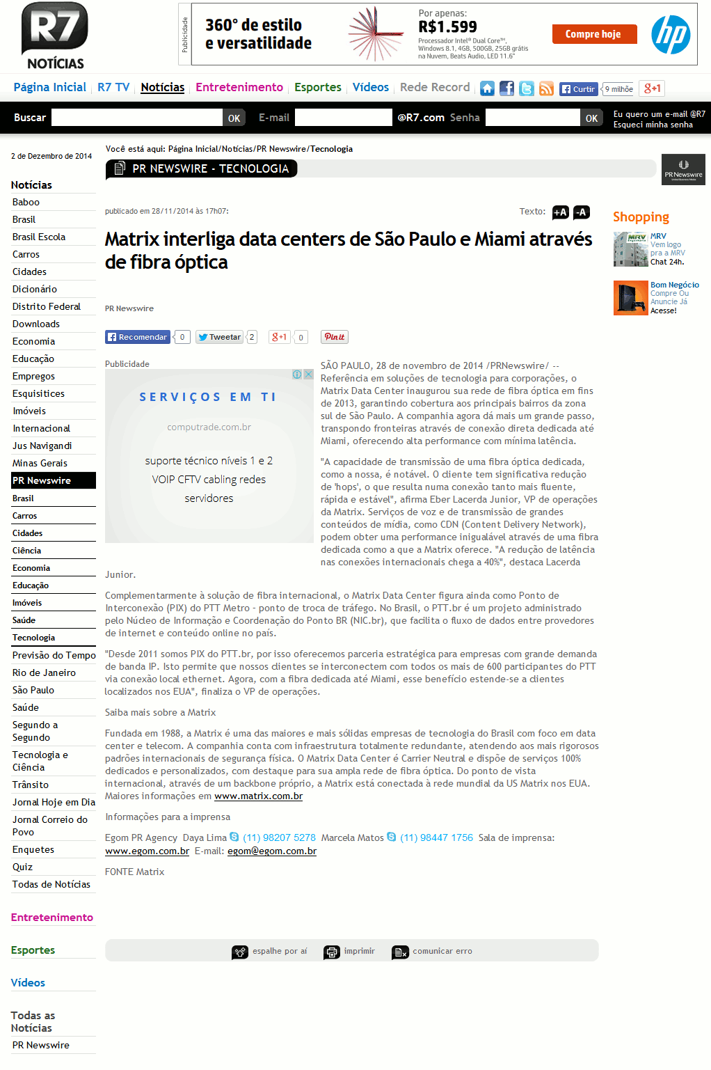 Referência em soluções de tecnologia para corporações, o Matrix Data Center inaugurou sua rede de fibra óptica em fins de 2013, garantindo cobertura aos principais bairros da zona sul de São Paulo. A companhia agora dá mais um grande passo, transpondo fronteiras através de conexão direta dedicada até Miami, oferecendo alta performance com mínima latência.