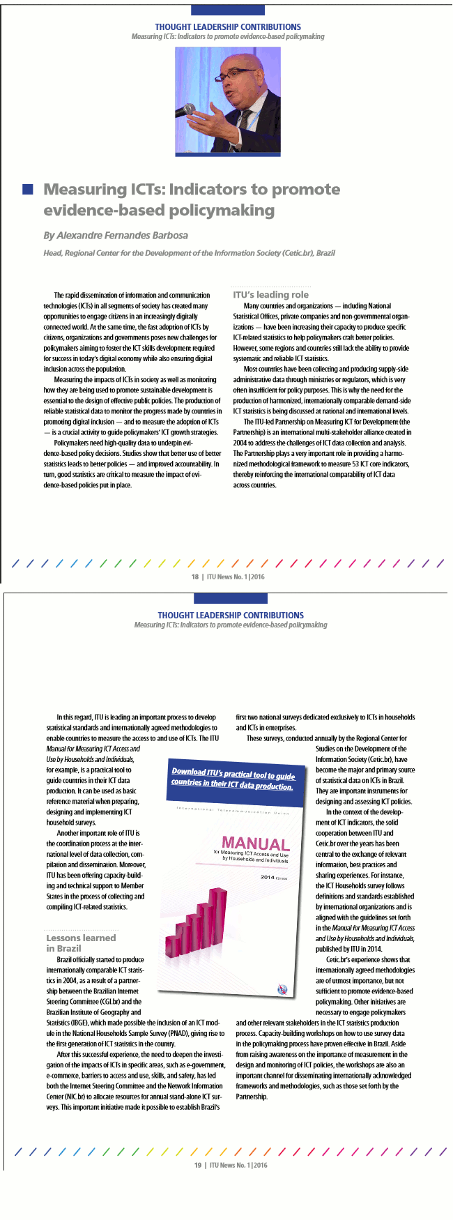 In the context of the development of ICT indicators, the solid cooperation between ITU and Cetic.br over the years has been central to the exchange of relevant information, best practices and sharing experiences. For instance, the ICT Households survey follows definitions and standards established by international organizations and is aligned with the guidelines set forth in the Manual for Measuring ICT Access and Use by Households and Individuals, published by ITU in 2014.