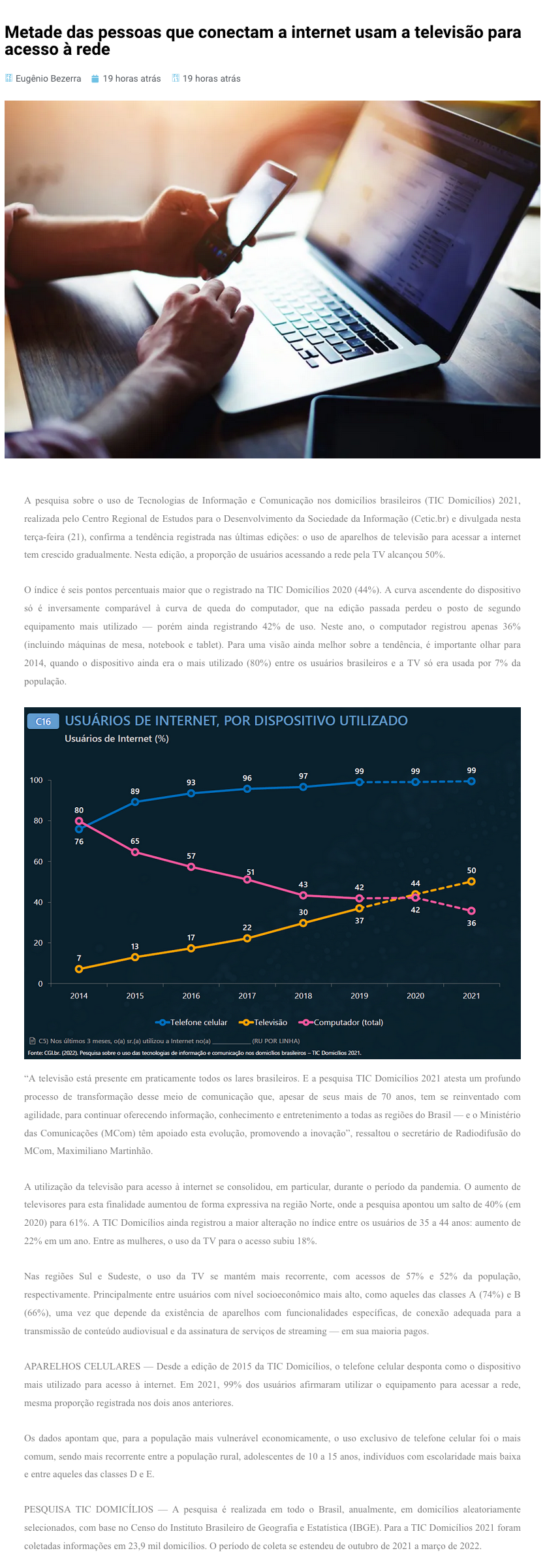 “A televisão está presente em praticamente todos os lares brasileiros. E a pesquisa TIC Domicílios 2021 atesta um profundo processo de transformação desse meio de comunicação que, apesar de seus mais de 70 anos, tem se reinventado com agilidade, para continuar oferecendo informação, conhecimento e entretenimento a todas as regiões do Brasil — e o Ministério das Comunicações (MCom) têm apoiado esta evolução, promovendo a inovação”, ressaltou o secretário de Radiodifusão do MCom, Maximiliano Martinhão.